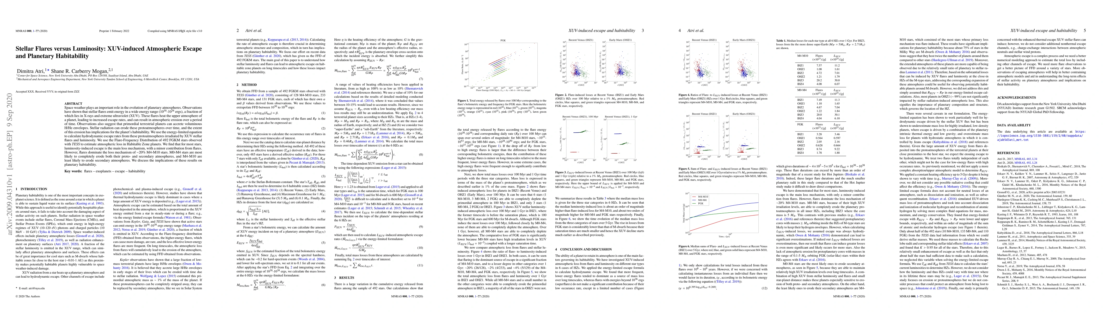 This paper investigates the impact of stellar flares and luminosity on planetary atmospheric escape and habitability. It finds that while luminosity-induced atmospheric loss is predominant for most stars, flares significantly affect smaller, cooler stars, potentially eroding their atmospheres and influencing habitability.