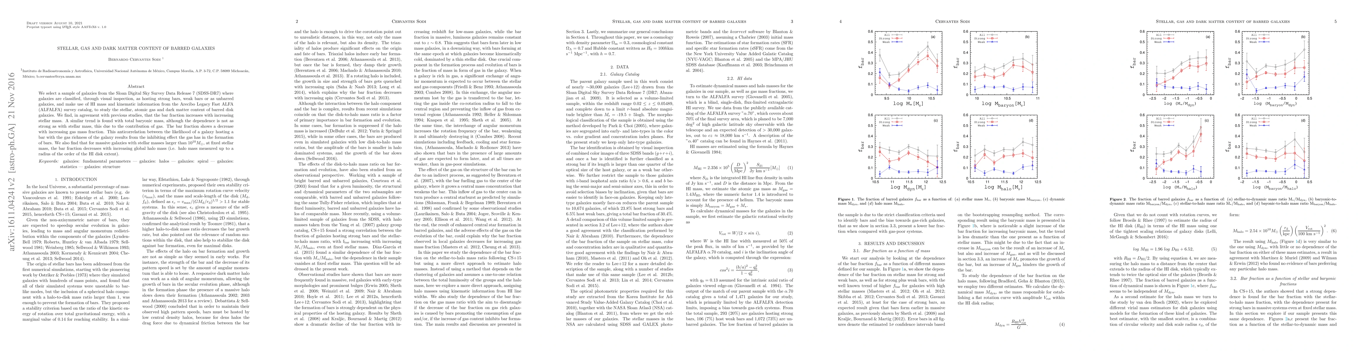 We select a sample of galaxies from the Sloan Digital Sky Survey Data Release 7 (SDSS-DR7) where galaxies are classified, through visual inspection, as hosting strong bars, weak bars or as unbarred galaxies, and make use of HI mass and kinematic information from the Arecibo Legacy Fast ALFA (ALFALFA) survey catalog, to study the stellar, atomic gas and dark matter content of barred disk galaxies. We find, in agreement with previous studies, that the bar fraction increases with increasing stellar mass. A similar trend is found with total baryonic mass, although the dependence is not as strong as with stellar mass, this due to the contribution of gas. The bar fraction shows a decrease with increasing gas mass fraction. This anticorrelation between the likelihood of a galaxy hosting a bar with the gas richness of the galaxy results from the inhibiting effect the gas has in the formation of bars. We also find that for massive galaxies with stellar masses larger than 10$^{10} M_{\odot}$, at fixed stellar mass, the bar fraction decreases with increasing global halo mass (i.e. halo mass measured up to a radius of the order of the HI disk extent).