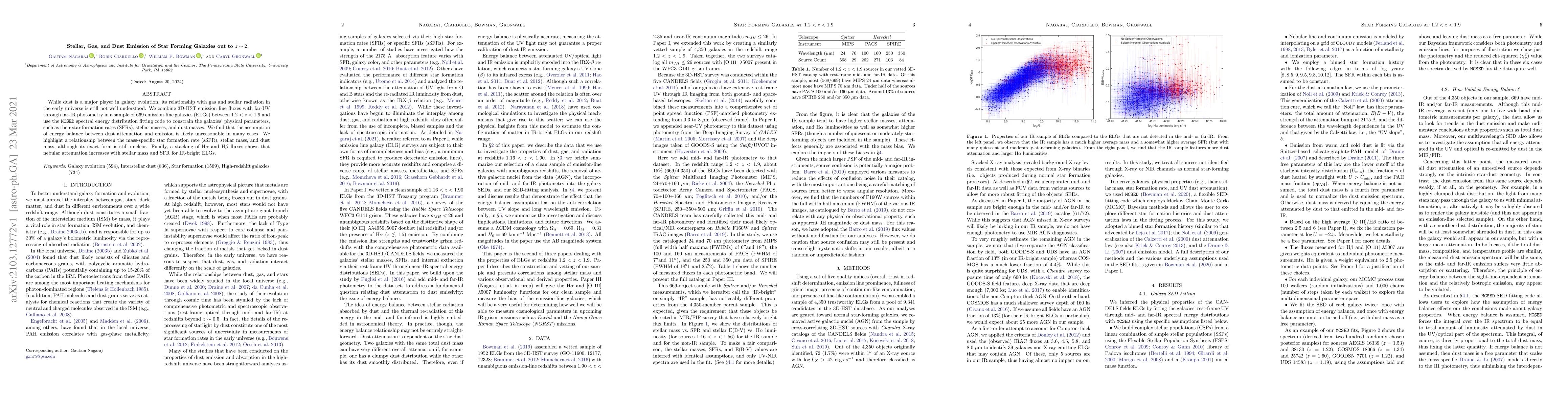 While dust is a major player in galaxy evolution, its relationship with gas and stellar radiation in the early universe is still not well understood. We combine 3D-HST emission line fluxes with far-UV through far-IR photometry in a sample of 669 emission-line galaxies (ELGs) between 1.2 < z < 1.9 and use the MCSED spectral energy distribution fitting code to constrain the galaxies' physical parameters, such as their star formation rates (SFRs), stellar masses, and dust masses. We find that the assumption of energy balance between dust attenuation and emission is likely unreasonable in many cases. We highlight a relationship between the mass-specific star formation rate (sSFR), stellar mass, and dust mass, although its exact form is still unclear. Finally, a stacking of H$\alpha$ and H$\beta$ fluxes shows that nebular attenuation increases with stellar mass and SFR for IR-bright ELGs.