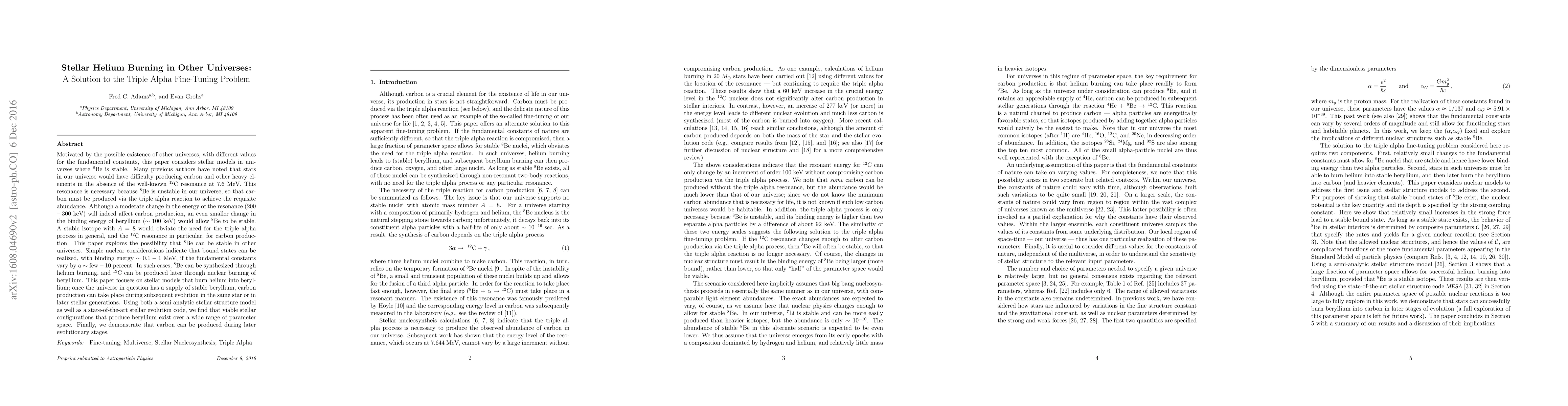 This paper explores stellar helium burning in hypothetical universes where $^8$Be is stable, proposing a solution to the triple alpha fine-tuning problem by eliminating the need for the $^{12}$C resonance in carbon production. It finds viable stellar models that can synthesize stable beryllium and produce carbon through subsequent nuclear burning processes.