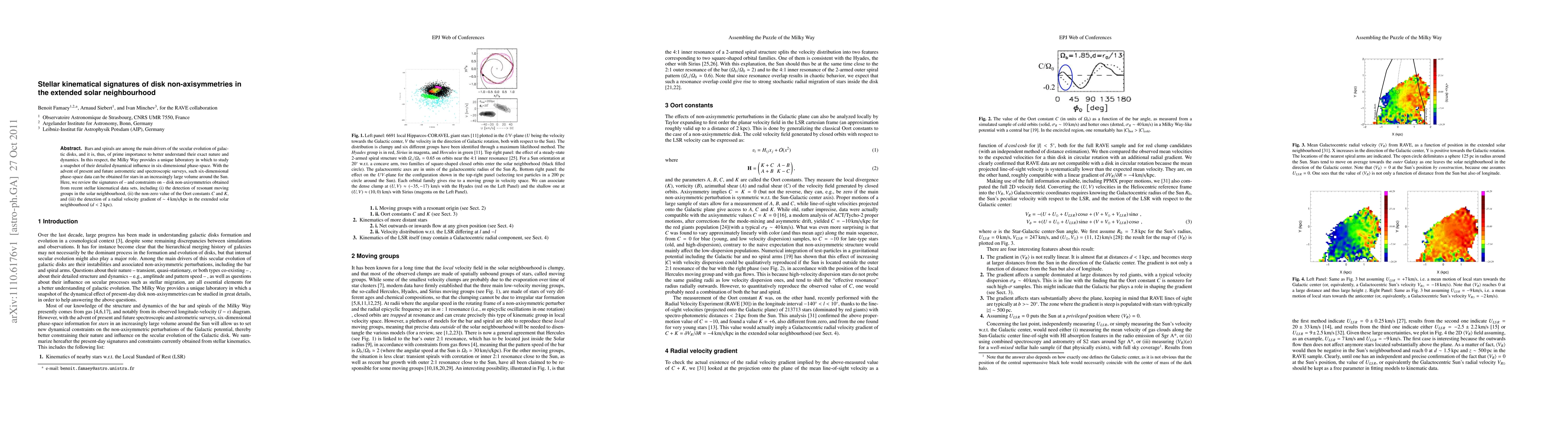 This paper reviews stellar kinematical data revealing signatures of disk non-axisymmetries in the Milky Way's extended solar neighborhood. Key findings include detection of resonant moving groups, non-zero Oort constants C and K, and a radial velocity gradient of 4 km/s/kpc within 2 kpc from the Sun, aiding our understanding of galactic disk evolution.