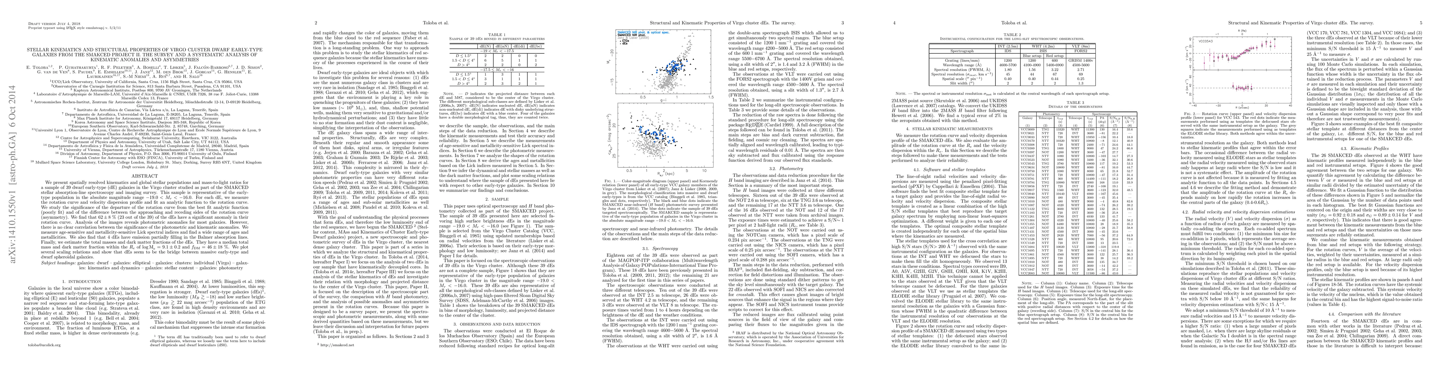 We present spatially resolved kinematics and global stellar populations and mass-to-light ratios for a sample of 39 dwarf early-type (dE) galaxies in the Virgo cluster studied as part of the SMAKCED stellar absorption-line spectroscopy and imaging survey. This sample is representative of the early-type population in the absolute magnitude range -19.0 < M_r < -16.0. For each dE, we measure the rotation curve and velocity dispersion profile and fit an analytic function to the rotation curve. We study the significance of the departure of the rotation curve from the best fit analytic function (poorly fit) and of the difference between the approaching and receding sides of the rotation curve (asymmetry). We find that 62 +/- 8 % (23 out of the 39) of the dEs have a significant anomaly in their rotation curve. Analysis of the images reveals photometric anomalies for most galaxies. However, there is no clear correlation between the significance of the photometric and kinematic anomalies. We measure age-sensitive and metallicity-sensitive Lick spectral indices and find a wide range of ages and metallicities. We also find that 4 dEs have emission partially filling in the Balmer absorption lines. Finally, we estimate the total masses and dark matter fractions of the dEs. They have a median total mass and dark matter fraction within the Re of log Me = 9.1 +/- 0.2 and f_DM = 46 +/- 18 %. We plot several scaling relations and show that dEs seem to be the bridge between massive early-type and dwarf spheroidal galaxies.