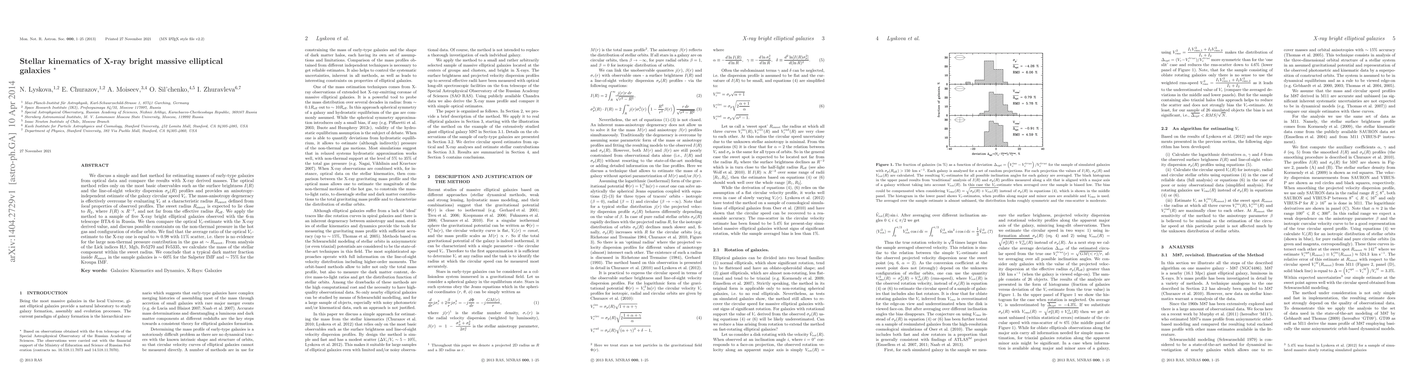 This paper presents a method to estimate the masses of massive elliptical galaxies using optical data, comparing these estimates to the X-ray derived masses. The optical method, based on surface brightness and velocity dispersion profiles, yields a circular speed estimate at a characteristic radius $R_{\rm sweet}$, showing no significant evidence of large non-thermal pressure contributions in the gas.