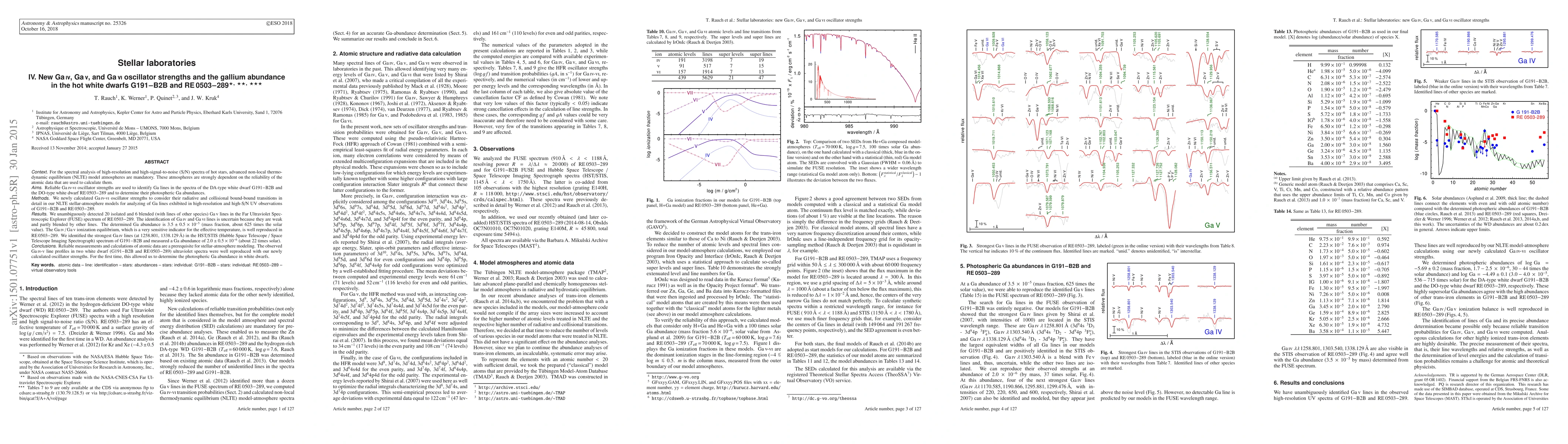 For the spectral analysis of high-resolution and high-signal-to-noise (S/N) spectra of hot stars, advanced non-local thermodynamic equilibrium (NLTE) model atmospheres are mandatory. These atmospheres are strongly dependent on the reliability of the atomic data that are used to calculate them. Reliable Ga IV - VI oscillator strengths are used to identify Ga lines in the spectra of the DA-type white dwarf G191-B2B and the DO-type white dwarf RE0503-289 and to determine their photospheric Ga abundances. We newly calculated Ga IV - VI oscillator strengths to consider their radiative and collisional bound-bound transitions in detail in our NLTE stellar-atmosphere models for analyzing of Ga lines exhibited in high-resolution and high-S/N UV observations of G191-B2B and RE0503-289. We unambiguously detected 20 isolated and 6 blended (with lines of other species) Ga V lines in the Far Ultraviolet Spectroscopic Explorer (FUSE) spectrum of RE0503-289. The identification of Ga IV and Ga VI lines is uncertain because they are weak and partly blended by other lines. The determined Ga abundance is 3.5 +/- 0.5 x 10**-5 (mass fraction, about 625 times solar). The Ga IV / GA V ionization equilibrium, which is a very sensitive indicator for the effective temperature, is well reproduced in RE0503-289. We identified the strongest Ga IV lines (1258.801, 1338.129 A) in the HST/STIS (Hubble Space Telescope / Space Telescope Imaging Spectrograph) spectrum of G191-B2B and measured a Ga abundance of 2.0 +/- 0.5 x 10**-6 (about 22 times solar). Reliable measurements and calculations of atomic data are a prerequisite for stellar-atmosphere modeling. Observed Ga IV - V line profiles in two white dwarf (G191-B2B and RE0503-289) ultraviolet spectra were well reproduced with our newly calculated oscillator strengths. For the first time, this allowed us to determine the photospheric Ga abundance in white dwarfs.
