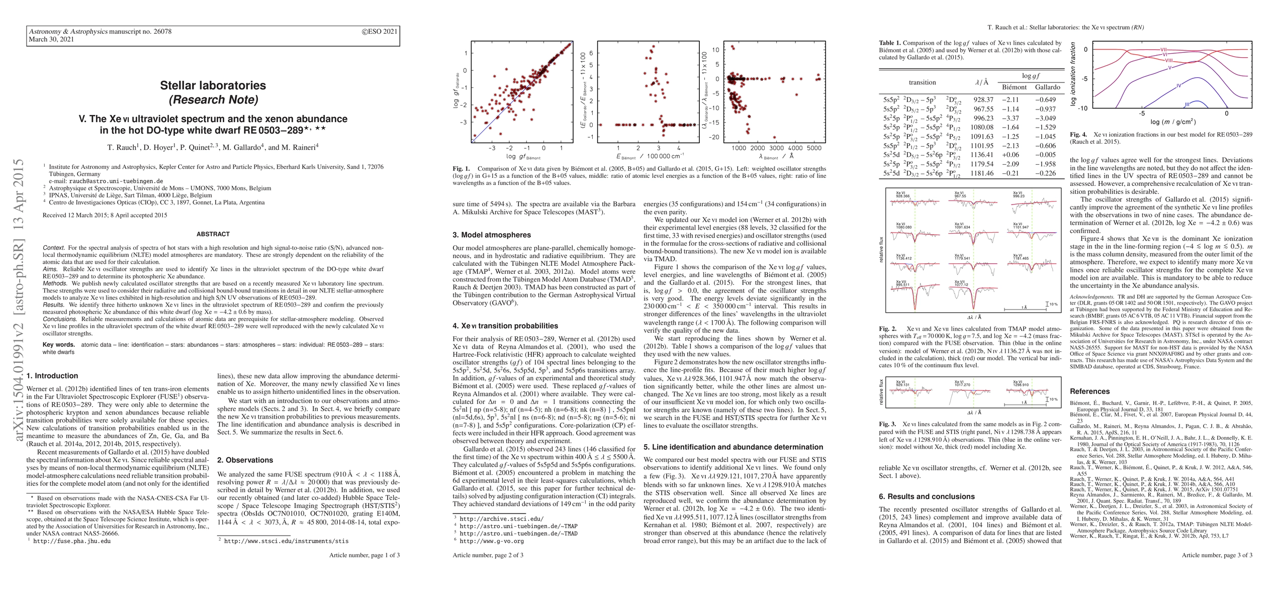 For the spectral analysis of spectra of hot stars with a high resolution and high signal-to-noise ratio (S/N), advanced non-local thermodynamic equilibrium (NLTE) model atmospheres are mandatory. These are strongly dependent on the reliability of the atomic data that are used for their calculation. Reliable Xe VI oscillator strengths are used to identify Xe lines in the ultraviolet spectrum of the DO-type white dwarf RE0503-289 and to determine its photospheric Xe abundance. We publish newly calculated oscillator strengths that are based on a recently measured Xe VI laboratory line spectrum. These strengths were used to consider their radiative and collisional bound-bound transitions in detail in our NLTE stellar-atmosphere models to analyze Xe VI lines exhibited in high-resolution and high S/N UV observations of RE0503-289. We identify three hitherto unknown Xe VI lines in the ultraviolet spectrum of RE0503-289 and confirm the previously measured photospheric Xe abundance of this white dwarf (log Xe = -4.2 +/- 0.6). Reliable measurements and calculations of atomic data are prerequisite for stellar-atmosphere modeling. Observed Xe VI line profiles in the ultraviolet spectrum of the white dwarf RE0503-289 were well reproduced with the newly calculated Xe VI oscillator strengths.