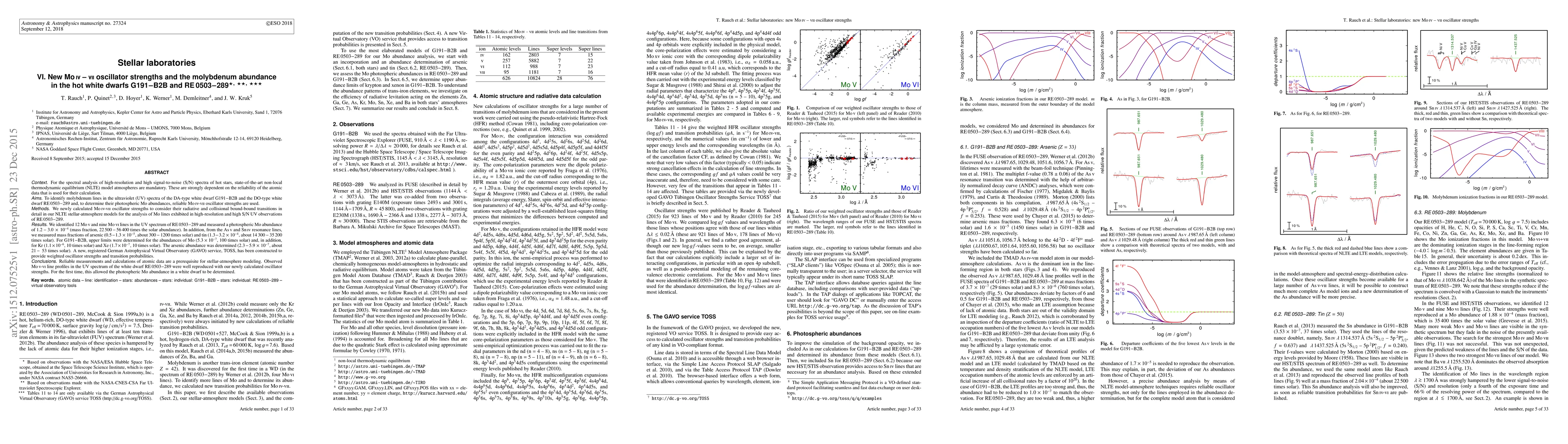 For the spectral analysis of high-resolution and high-signal-to-noise (S/N) spectra of hot stars, state-of-the-art non-local thermodynamic equilibrium (NLTE) model atmospheres are mandatory. These are strongly dependent on the reliability of the atomic data that is used for their calculation. To identify molybdenum lines in the ultraviolet (UV) spectra of the DA-type white dwarf G191-B2B and the DO-type white dwarf RE0503-289 and to determine their photospheric Mo abundances, newly calculated Mo IV - VII oscillator strengths are used. We identified twelve Mo V and nine Mo VI lines in the UV spectrum of RE0503-289 and measured a photospheric Mo abundance of 1.2 - 3.0 x 10**-4 (mass fraction, 22500 - 56400 times the solar abundance). In addition, from the As V and Sn IV resonance lines, we measured mass fractions of arsenic (0.5 - 1.3 x 10**-5, about 300 - 1200 times solar) and tin (1.3 - 3.2 x 10**-4, about 14300 35200 times solar). For G191-B2B, upper limits were determined for the abundances of Mo (5.3 x 10**-7, 100 times solar) and, in addition, for Kr (1.1 x 10**-6, 10 times solar) and Xe (1.7 x 10**-7, 10 times solar). The arsenic abundance was determined (2.3 - 5.9 x 10**-7, about 21 - 53 times solar). A new, registered German Astrophysical Virtual Observatory (GAVO) service, TOSS, has been constructed to provide weighted oscillator strengths and transition probabilities. Reliable measurements and calculations of atomic data are a prerequisite for stellar-atmosphere modeling. Observed Mo V - VI line profiles in the UV spectrum of the white dwarf RE0503-289 were well reproduced with our newly calculated oscillator strengths. For the first time, this allowed to determine the photospheric Mo abundance in a white dwarf.
