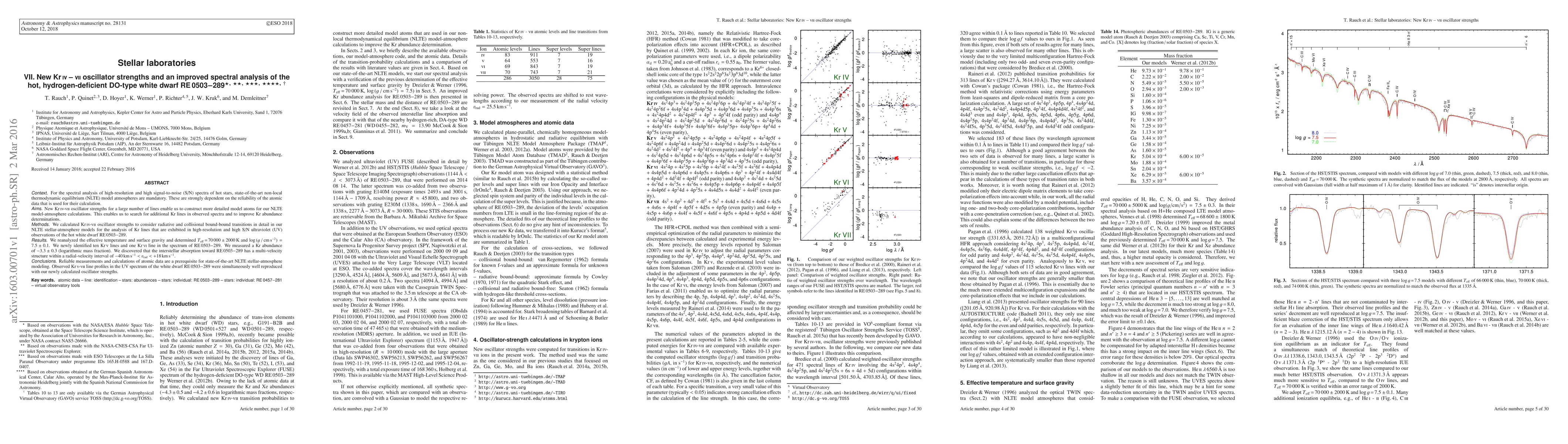 For the spectral analysis of high-resolution and high-signal-to-noise (S/N) spectra of hot stars, state-of-the-art non-local thermodynamic equilibrium (NLTE) model atmospheres are mandatory. These are strongly dependent on the reliability of the atomic data that is used for their calculation. New of Kr IV - VII oscillator strengths for a large number of lines allow to construct more detailed model atoms for our NLTE model-atmosphere calculations. This enables us to search for additional Kr lines in observed spectra and to improve Kr abundance determinations. We calculated Kr IV - VII oscillator strengths to consider radiative and collisional bound-bound transitions in detail in our NLTE stellar-atmosphere models for the analysis of Kr lines exhibited in high-resolution and high-S/N ultraviolet (UV) observations of the hot white dwarf RE 0503-289. We reanalyzed the effective temperature and surface gravity and determined Teff = 70 000 +/- 2000 K and log (g / cm/s**2) = 7.5 +/- 0.1. We newly identified ten Kr V lines and one Kr VI line in the spectrum of RE 0503-289. We measured a Kr abundance of -3.3 +/- 0.3 (logarithmic mass fraction). We discovered that the interstellar absorption toward RE 0503-289 has a multi-velocity structure within a radial-velocity interval of -40 km/s < vrad < +18 km/s. Reliable measurements and calculations of atomic data are a prerequisite for state-of-the-art NLTE stellar-atmosphere modeling. Observed Kr V - VII line profiles in the UV spectrum of the white dwarf RE 0503-289 were simultaneously well reproduced with our newly calculated oscillator strengths.