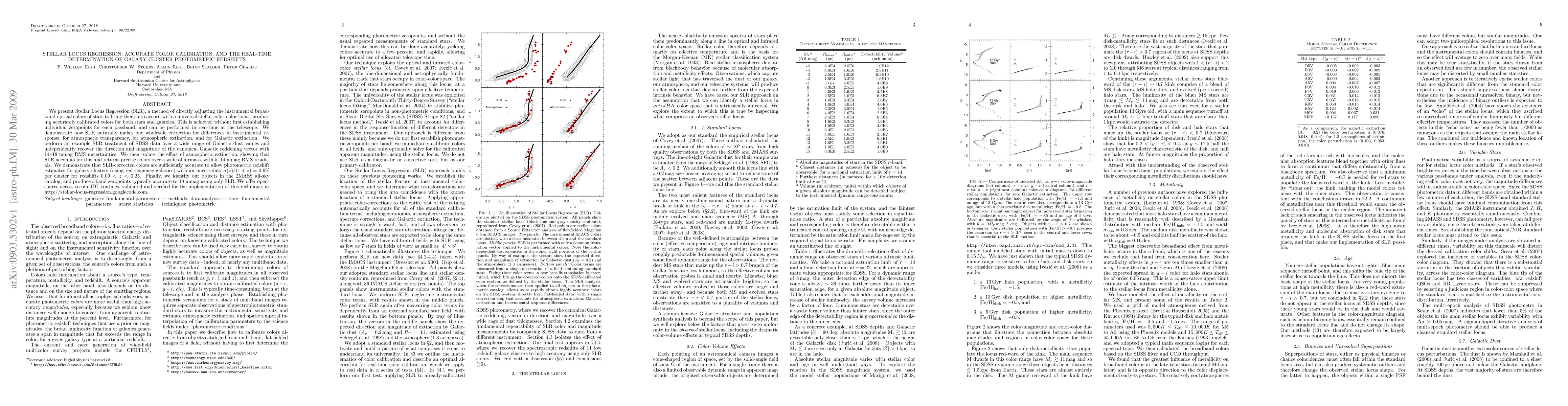Stellar Locus Regression (SLR) calibrates instrumental broadband optical colors by aligning them with a universal stellar color-color locus, enabling real-time adjustments at telescopes. SLR-corrected colors yield precise photometric redshift estimates for galaxy clusters with an uncertainty of 0.6% per cluster.