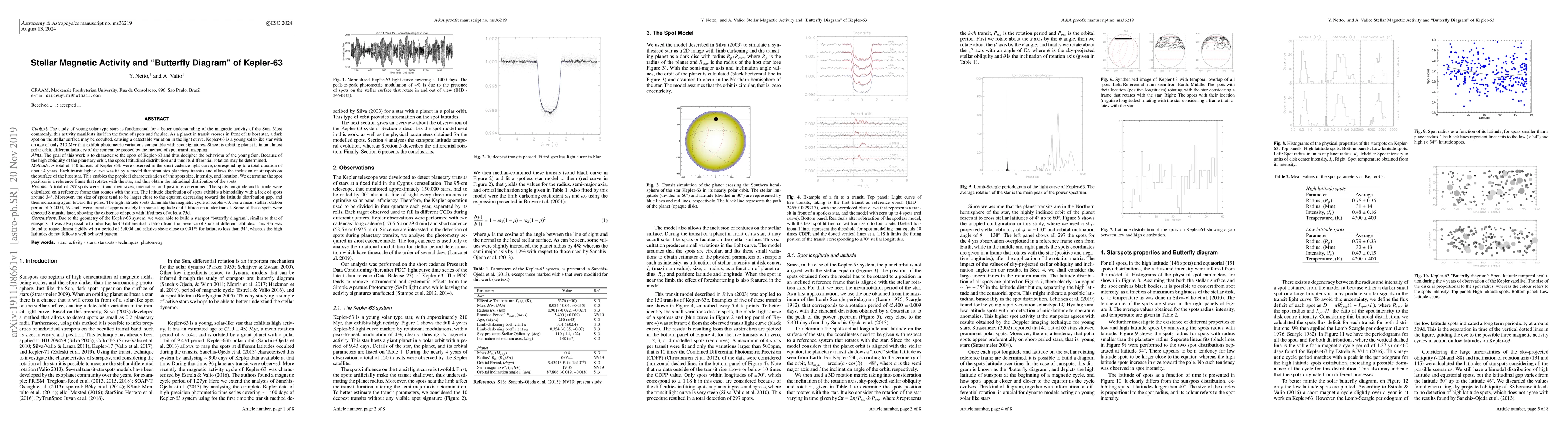 Context. The study of young solar type stars is fundamental for a better understanding of the magnetic activity of the Sun. As a planet in transit crosses in front of its host star, a darkspot on the stellar surface may be occulted, causing a detectable variation in the light curve. Kepler-63 is a young solar-like star withan age of only 210 Myr that exhibit photometric variations compatible with spot signatures. Since its orbiting planet is in an almostpolar orbit, different latitudes of the star can be probed by the method of spot transit mapping. Methods. A total of 150 transits of Kepler-63b were observed in the short cadence light curve, corresponding to a total duration of about 4 years. Each transit light curve was fit by a model that simulates planetary transits and allows the inclusion of starspots on the surface of the host star. This enables the physical characterisation of the spots size, intensity, and location. We determine the spot position in a reference frame that rotates with the star, and thus obtain the latitudinal distribution of the spots. Results. A total of 297 spots were fit and their sizes, intensities, and positions determined. The latitude distribution of spots exhibits a bimodality with a lack of spots around 34{\deg}. The high latitude spots dominate the magnetic cycle of Kepler-63. For a mean stellar rotation period of 5.400d, 59 spots were found at approximately the same longitude and latitude on a later transit. Conclusions. Due to the geometry of the Kepler-63 system, we were able to build a starspot "butterfly diagram". It was also possible to infer Kepler-63 differential rotation from the presence of spots at different latitudes. This star was found to rotate almost rigidly with a period of 5.400d and relative shear close to 0.01% for latitudes less than 34{\deg}, whereas the high latitudes do not follow a well behaved pattern.