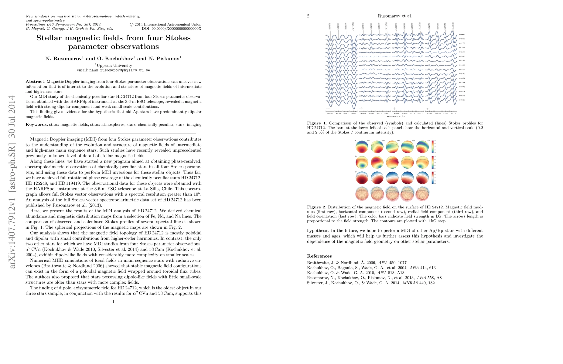 Magnetic Doppler imaging from four Stokes parameter observations has uncovered a new level of complexity of stellar magnetic fields previously not known. This new information is of interest to the evolution and structure of magnetic fields of intermediate and high-mass stars. Recently, we performed magnetic Doppler imaging study of the chemically peculiar star HD 24712 using phase-resolved spectropolarimetric observations of line-profiles in all four Stokes parameters. The observations were obtained with the HARPSpol instrument on the 3.6-m ESO telescope. Our analysis shows that the magnetic field of HD 24712 has very strong dipolar component with weak small-scale contributions. The finding of dipole-like field for HD 24712 gives evidence for the hypothesis that old Ap stars have predominantly dipolar magnetic fields. We plan on performing magnetic Doppler imaging from four Stokes parameter observations for other Ap/Bp stars as well, which will help us understand the nature of magnetic fields in these stars.