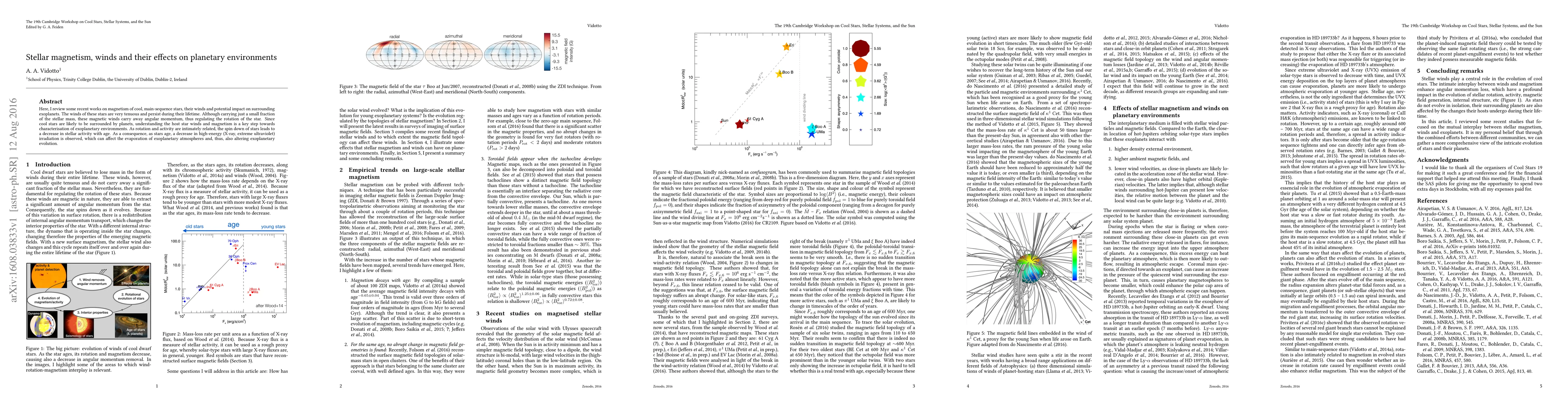 Here, I review some recent works on magnetism of cool, main-sequence stars, their winds and potential impact on surrounding exoplanets. The winds of these stars are very tenuous and persist during their lifetime. Although carrying just a small fraction of the stellar mass, these magnetic winds carry away angular momentum, thus regulating the rotation of the star. Since cool stars are likely to be surrounded by planets, understanding the host star winds and magnetism is a key step towards characterisation of exoplanetary environments. As rotation and activity are intimately related, the spin down of stars leads to a decrease in stellar activity with age. As a consequence, as stars age, a decrease in high-energy (X-ray, extreme ultraviolet) irradiation is observed, which can a ect the evaporation of exoplanetary atmospheres and, thus, also altering exoplanetary evolution.
