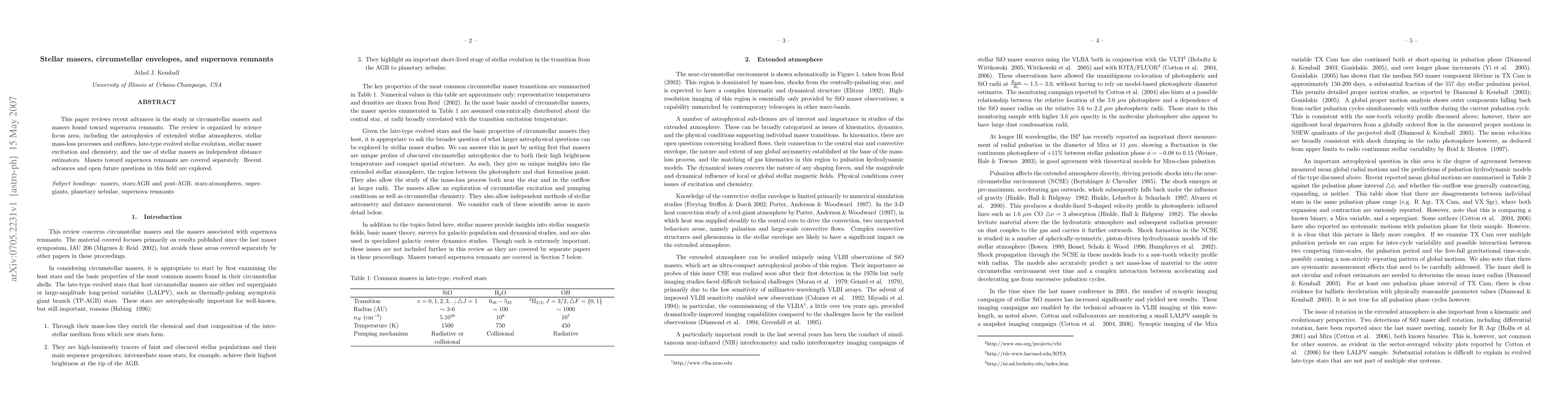 This paper reviews recent advances in the study of circumstellar masers and masers in supernova remnants, focusing on stellar atmospheres, mass-loss processes, and their use as distance estimators, while also exploring open questions in the field.