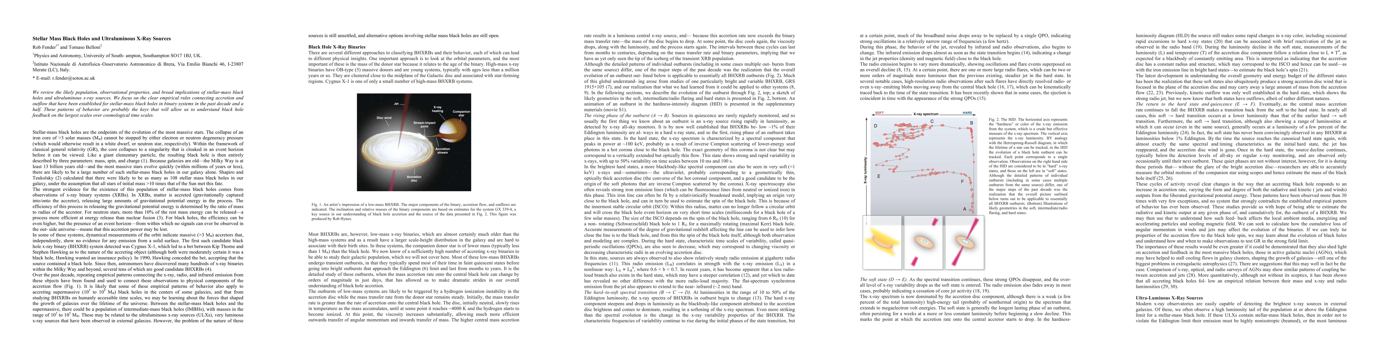 We review the likely population, observational properties, and broad implications of stellar-mass black holes and ultraluminous x-ray sources. We focus on the clear empirical rules connecting accretion and outflow that have been established for stellar-mass black holes in binary systems in the past decade and a half. These patterns of behavior are probably the keys that will allow us to understand black hole feedback on the largest scales over cosmological time scales.
