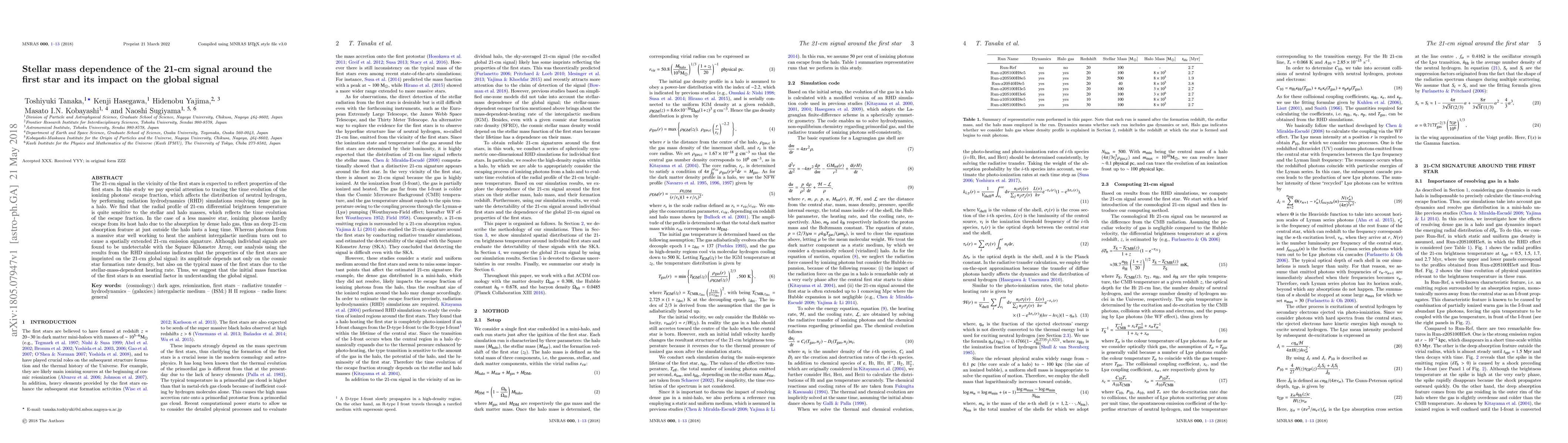 The 21-cm signal in the vicinity of the first stars is expected to reflect properties of the first stars. In this study we pay special attention to tracing the time evolution of the ionizing photons' escape fraction, which affects the distribution of neutral hydrogen, by performing radiation hydrodynamics (RHD) simulations resolving dense gas in a halo. We find that the radial profile of 21-cm differential brightness temperature is quite sensitive to the stellar and halo masses, which reflects the time evolution of the escape fraction. In the case of a less massive star, ionizing photons hardly escape from its host halo due to the absorption by dense halo gas, thus an deep 21-cm absorption feature at just outside the halo lasts a long time. Whereas photons from a massive star well working to heat the ambient intergalactic medium turn out to cause a spatially extended 21-cm emission signature. Although individual signals are found to be undetectable with the Square Kilometre Array, our analysis using the results from the RHD simulations indicates that the properties of the first stars are imprinted on the 21-cm global signal: its amplitude depends not only on the cosmic star formation rate density, but also on the typical mass of the first stars due to the stellar-mass-dependent heating rate. Thus, we suggest that the initial mass function of the first stars is an essential factor in understanding the global signal.