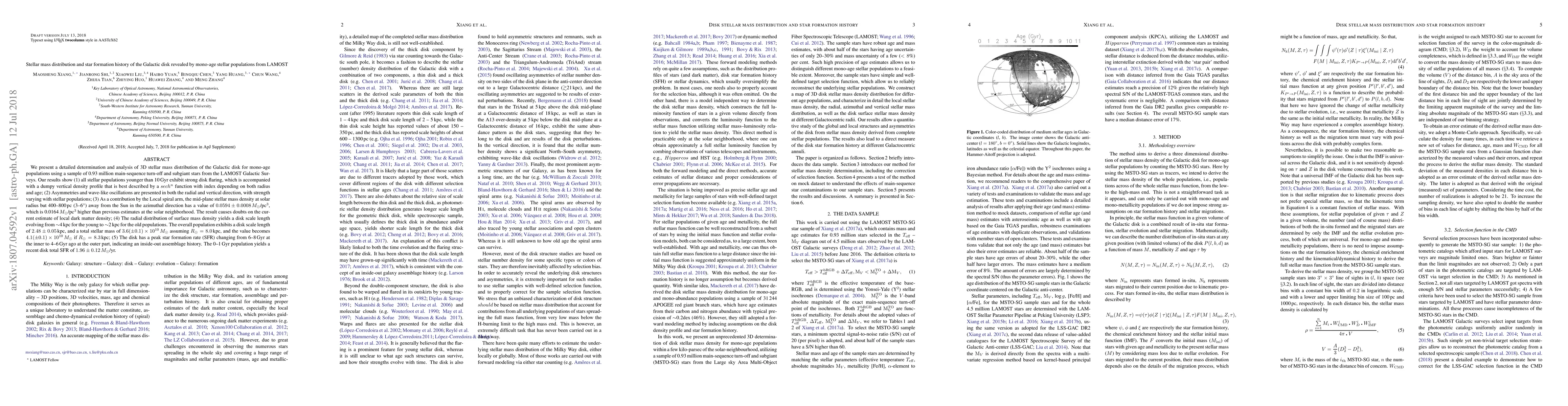 This paper analyzes the 3D stellar mass distribution and star formation history of the Galactic disk using mono-age populations from LAMOST data. It finds a strong disk flaring, asymmetries in stellar populations, and an increased stellar mass density in the local spiral arm, suggesting an inside-out star formation history.
