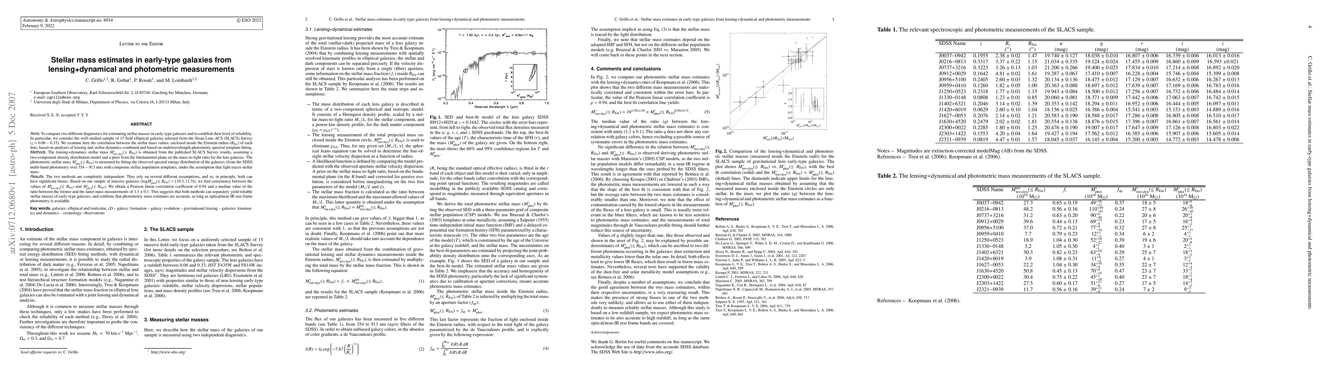 In this paper we compare two different diagnostics for estimating stellar masses in early-type galaxies and we establish their level of reliability. In particular, we consider the well-studied sample of 15 field elliptical galaxies selected from the Sloan Lens ACS (SLACS) Survey (z = 0.06-0.33). We examine here the correlation between the stellar mass values, enclosed inside the Einstein radius of each lens, based on analyses of lensing and stellar dynamics combined and based on multiwavelength photometry spectral template fitting. The lensing+dynamics stellar mass is obtained from the published SLACS Survey results, assuming a two-component density distribution model and a prior from the fundamental plane on the mass-to-light ratio for the lens galaxies. The photometric stellar mass is measured by fitting the observed spectral energy distribution of the galaxies (from the SDSS multi-band photometry over 354-913 nm) with composite stellar population templates, under the assumption that light traces stellar mass. The two methods are completely independent. They rely on several different assumptions, and so, in principle, both can have significant biases. Based on our sample of massive galaxies, we find consistency between the lensing+dynamics and the photometric mass estimates. We obtain a Pearson linear correlation coefficient of 0.94 and a median value of the ratio between the former and the latter mass measurements of 1.1+/-0.1. This suggests that both methods can separately yield reliable stellar masses of early-type galaxies, and confirms that photometric mass estimates are accurate, as long as optical/near-IR rest frame photometry is available.