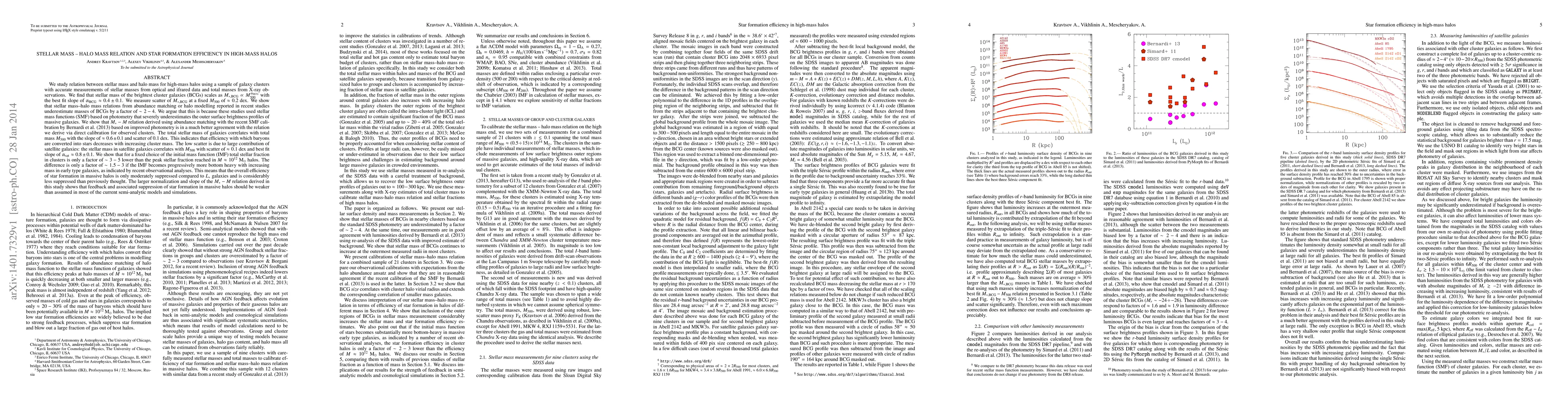 This study investigates the stellar mass-halo mass relation in high-mass halos using galaxy clusters, revealing that stellar mass of brightest cluster galaxies scales with halo mass with a slope of ~0.35 and a scatter of 0.2 dex. It finds that previous underestimations of stellar masses in these galaxies were due to flawed photometric methods. The research concludes that star formation efficiency decreases with cluster mass, but the suppression of star formation in massive halos is less severe than previously thought, suggesting weaker feedback mechanisms.