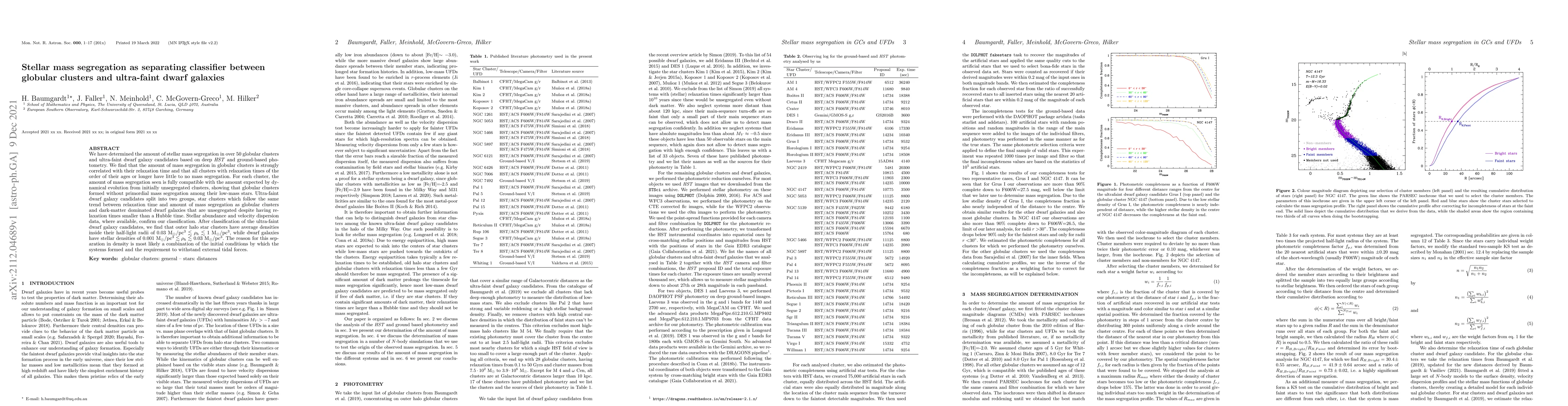 We have determined the amount of stellar mass segregation in over 50 globular clusters and ultra-faint dwarf galaxy candidates based on deep HST and ground-based photometry. We find that the amount of mass segregation in globular clusters is strongly correlated with their relaxation time and that all clusters with relaxation times of the order of their ages or longer have little to no mass segregation. For each cluster, the amount of mass segregation seen is fully compatible with the amount expected by dynamical evolution from initially unsegregated clusters, showing that globular clusters formed without primordial mass segregation among their low-mass stars. Ultra-faint dwarf galaxy candidates split into two groups, star clusters which follow the same trend between relaxation time and amount of mass segregation as globular clusters and dark-matter dominated dwarf galaxies that are unsegregated despite having relaxation times smaller than a Hubble time. Stellar abundance and velocity dispersion data, where available, confirm our classification. After classification of the ultra-faint dwarf galaxy candidates, we find that outer halo star clusters have average densities inside their half-light radii of 0.03 M$_\odot$/pc$^3 \lesssim \rho_h \lesssim$ 1 M$_\odot$/pc$^3$, while dwarf galaxies have stellar densities of 0.001 M$_\odot$/pc$^3 \lesssim \rho_h \lesssim $ 0.03 M$_\odot$/pc$^3$. The reason for this separation in density is most likely a combination of the initial conditions by which the systems formed and the requirement to withstand external tidal forces.