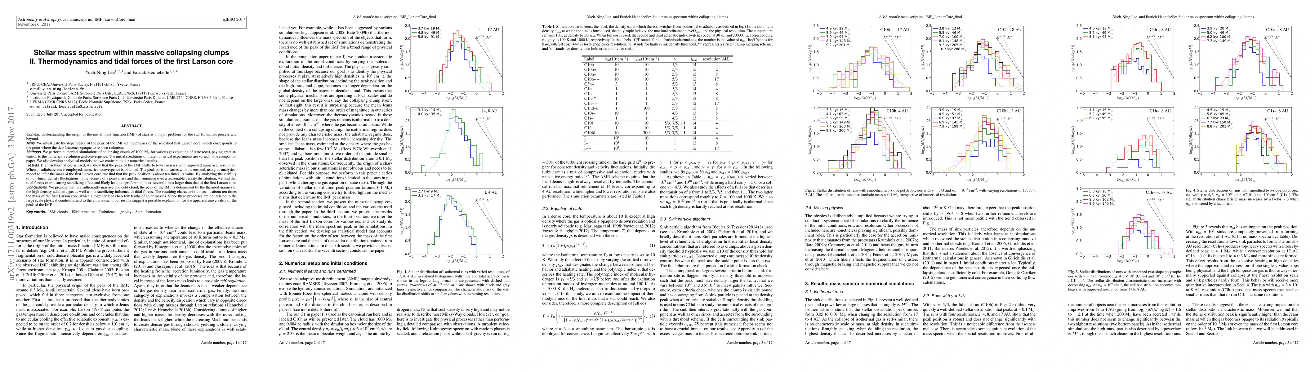 We investigate the dependence of the peak of the IMF on the physics of the so-called first Larson core, which corresponds to the point where the dust becomes opaque to its own radiation. We perform numerical simulations of collapsing clouds of $1000 M_\odot$ for various gas equation of state (eos), paying great attention to the numerical resolution and convergence. The initial conditions of these numerical experiments are varied in the companion paper. We also develop analytical models that we confront to our numerical results. If an isothermal eos is used, we show that the peak of the IMF shifts to lower masses with improved numerical resolution. When an adiabatic eos is employed, numerical convergence is obtained. The peak position varies with the eos and we find that the peak position is about ten times the mass of the first Larson core. By analyzing the stability of non-linear density fluctuations in the vicinity of a point mass and then summing over a reasonable density distribution, we find that tidal forces exert a strong stabilizing effect and likely lead to a preferential mass several times larger than that of the first Larson core. We propose that in a sufficiently massive and cold cloud, the peak of the IMF is determined by the thermodynamics of the high density adiabatic gas as well as the stabilizing influence of tidal forces. The resulting characteristic mass is about ten times the mass of the first Larson core, which altogether leads to a few tenths of solar masses. Since these processes are not related to the large scale physical conditions and to the environment, our results suggest a possible explanation for the apparent universality of the peak of the IMF.