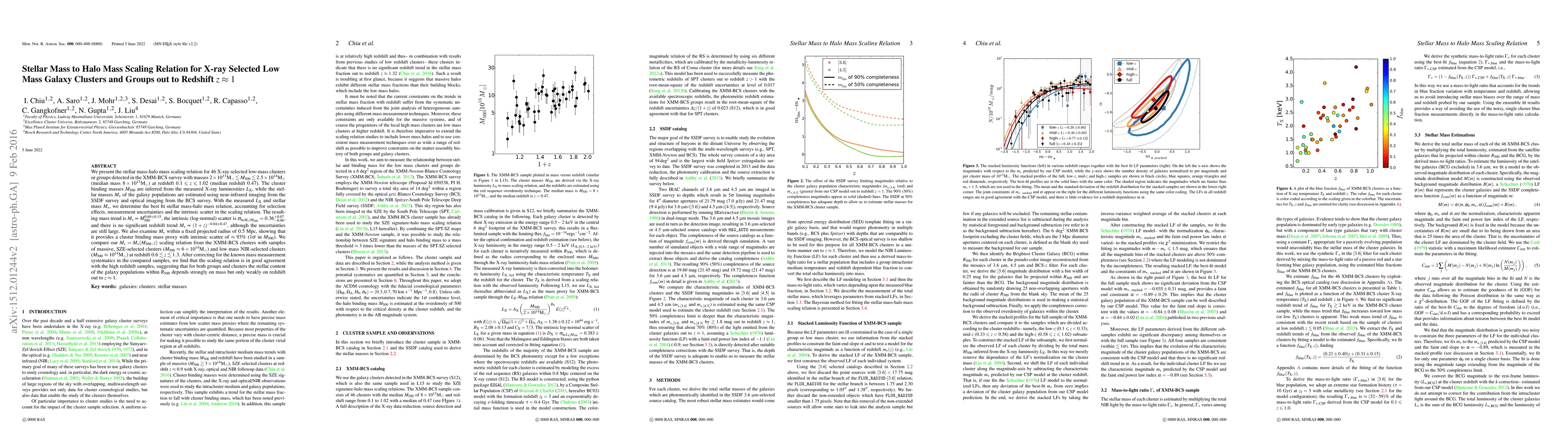 This paper investigates the stellar mass-halo mass scaling relation for low-mass galaxy clusters and groups, finding a trend of $M_{\star}\propto M_{500}^{0.69\pm0.15}$ with intrinsic scatter $\sigma_{\ln M_{\star}|M_{500}}=0.36^{+0.07}_{-0.06}$. The study shows that the relation is consistent with high-redshift samples, indicating a strong mass dependence but weak redshift dependence.