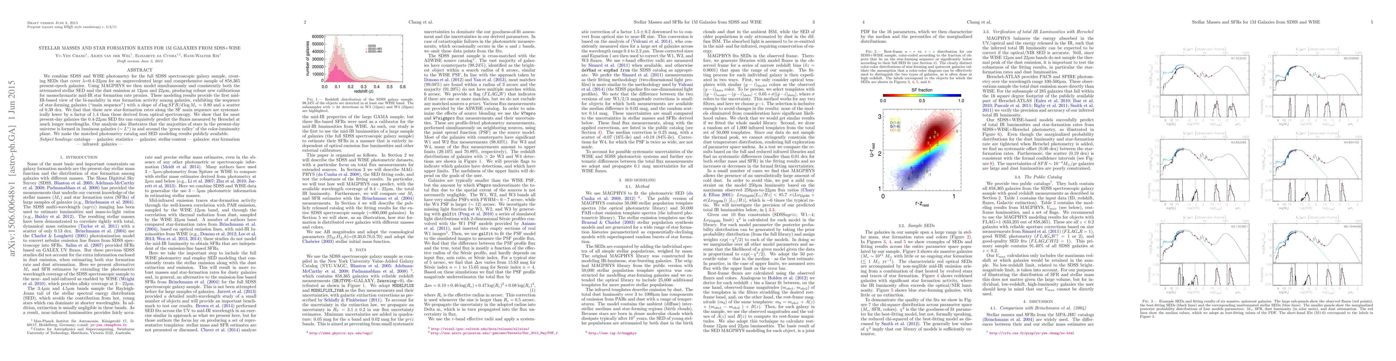 We combine SDSS and WISE photometry for the full SDSS spectroscopic galaxy sample, creating SEDs that cover lambda=0.4-22 micron for an unprecedented large and comprehensive sample of 858,365 present-epoch galaxies. Using MAGPHYS we then model simultaneously and consistently both the attenuated stellar SED and the dust emission at 12 micron and 22 micron, producing robust new calibrations for monochromatic mid-IR star formation rate proxies. These modeling results provide the first mid-IR-based view of the bi-modality in star formation activity among galaxies, exhibiting the sequence of star-forming galaxies (main sequence) with a slope of dlogSFR/dlogM*=0.80 and a scatter of 0.39 dex. We find that these new star-formation rates along the SF main sequence are systematically lower by a factor of 1.4 than those derived from optical spectroscopy. We show that for most present-day galaxies the 0.4-22 micron SED fits can exquisitely predict the fluxes measured by Herschel at much longer wavelengths. Our analysis also illustrates that the majorities of stars in the present-day universe is formed in luminous galaxies (~L*) in and around the green valley of the color-luminosity plane. We make the matched photometry catalog and SED modeling results publicly available.