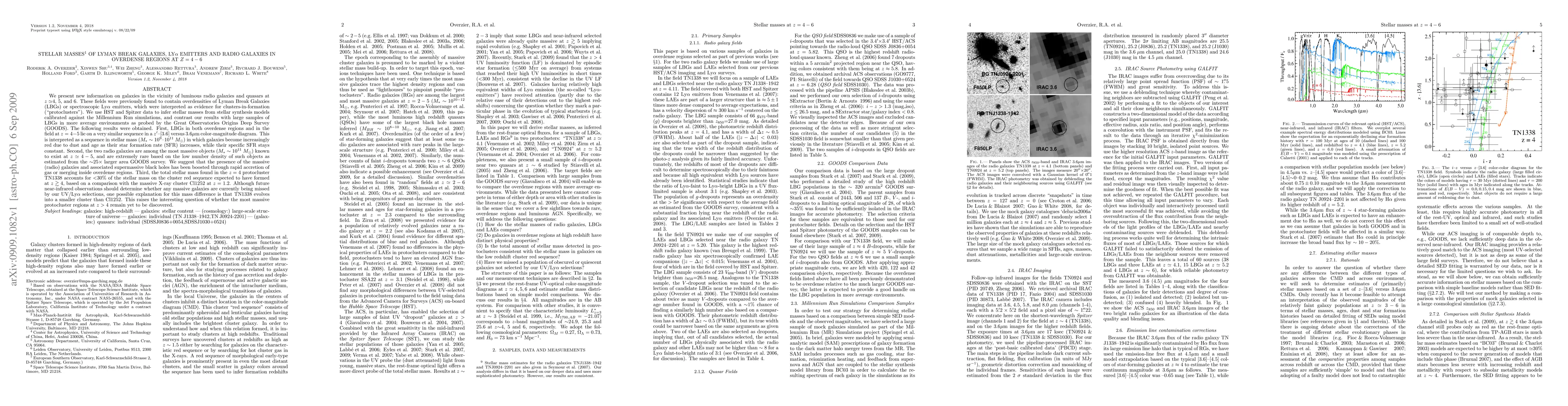 This study uses HST and Spitzer data to determine stellar masses of Lyman Break Galaxies, Lyman Alpha Emitters, and Radio Galaxies in overdense regions at z=4-6, finding that these galaxies follow similar mass sequences as those in average environments but are significantly more massive and rare. The study suggests rapid accretion or merging in overdense regions boosts the formation of these massive galaxies.