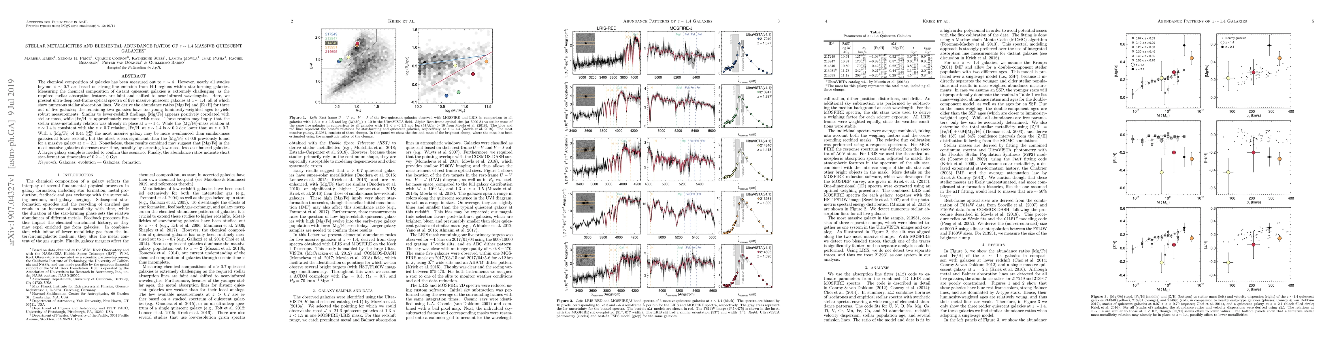 This paper investigates the stellar metallicities and elemental abundance ratios of five massive quiescent galaxies at z~1.4 using ultra-deep spectra, finding that [Mg/Fe] correlates with stellar mass while [Fe/H] remains constant, suggesting an established stellar mass-metallicity relation at z~1.4. The study indicates a potential decrease in [Mg/Fe] over time in the most massive galaxies, possibly due to accretion of less alpha-enhanced galaxies.