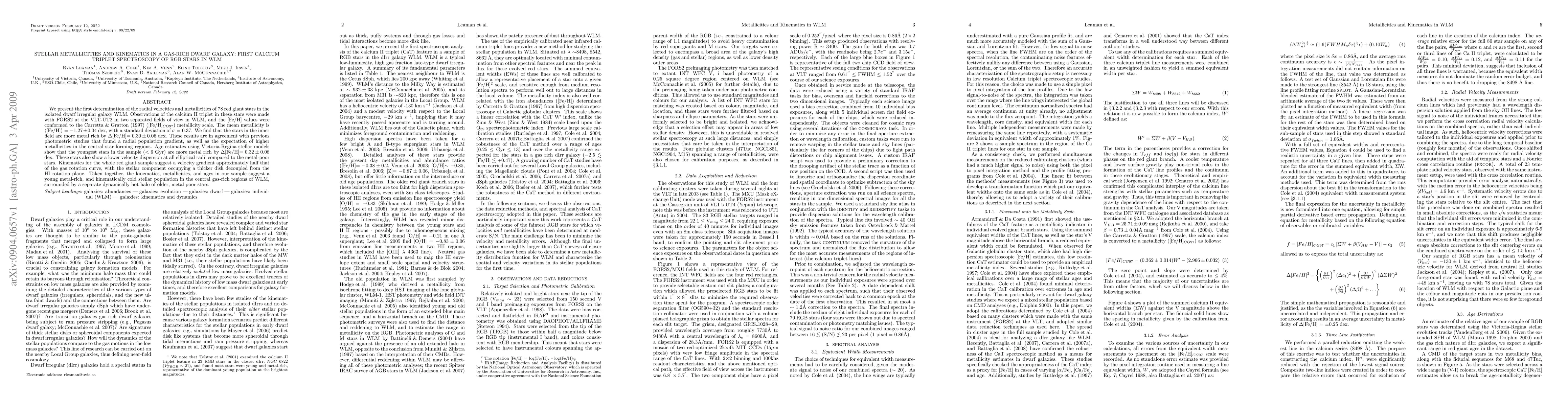 This paper reports the first calcium triplet spectroscopy of red giant stars in the dwarf irregular galaxy WLM, revealing a mean metallicity of <[Fe/H]> = -1.27 +/- 0.04 dex. The central stars exhibit higher metallicity and lower velocity dispersion, suggesting a young, metal-rich, and kinematically cold stellar population in the gas-rich core, contrasting with a dynamically hot halo of older, metal-poor stars.