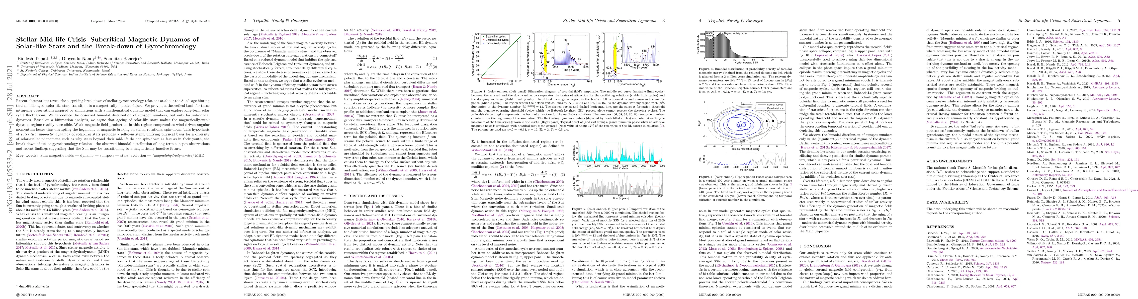This paper explores the breakdown of gyrochronology in middle-aged solar-like stars, revealing a transition to magnetic inactivity. It proposes that subcritical magnetic dynamos, which produce weak magnetic fields, disrupt traditional magnetic braking on stellar rotation, explaining the observed phenomena.