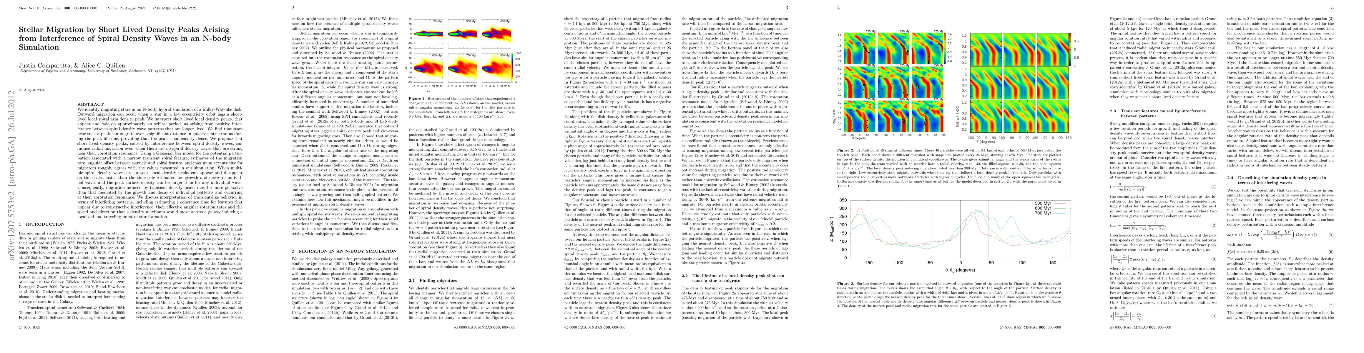 We identify migrating stars in an N-body simulation of a Milky-Way-like disk. Outward migration can occur when a star in a low eccentricity orbit lags a short-lived local spiral arm density peak. We interpret short lived local density peaks, that appear and fade on approximately an orbital period, as arising from positive interference between spiral density wave patterns. Stars near such a peak can migrate over a significant distance in galactocentric radius during the peak lifetime, providing that the peak is sufficiently dense. Using a Gaussian bar model for the potential perturbation associated with a narrow transient spiral feature, estimates of the migration rate, angular offset between particle and spiral feature, and maximum eccentricity for migrators roughly agrees with the values measured in our simulation. When multiple spiral density waves are present, local density peaks can appear and disappear on timescales faster than the timescale estimated for growth and decay of individual waves and the peak surface density can be larger than for any individual wave. Consequently, migration induced by transient density peaks may be more pervasive than that mediated by the growth and decay of individual patterns and occurring at their corotation resonance. We discuss interpretation of transient-like behavior in terms of interfering patterns, including estimating a coherence time for features that appear due to constructive interference, their effective angular rotation rates and the speed and direction that a density maximum would move across a galaxy inducing a localized and traveling burst of star formation.