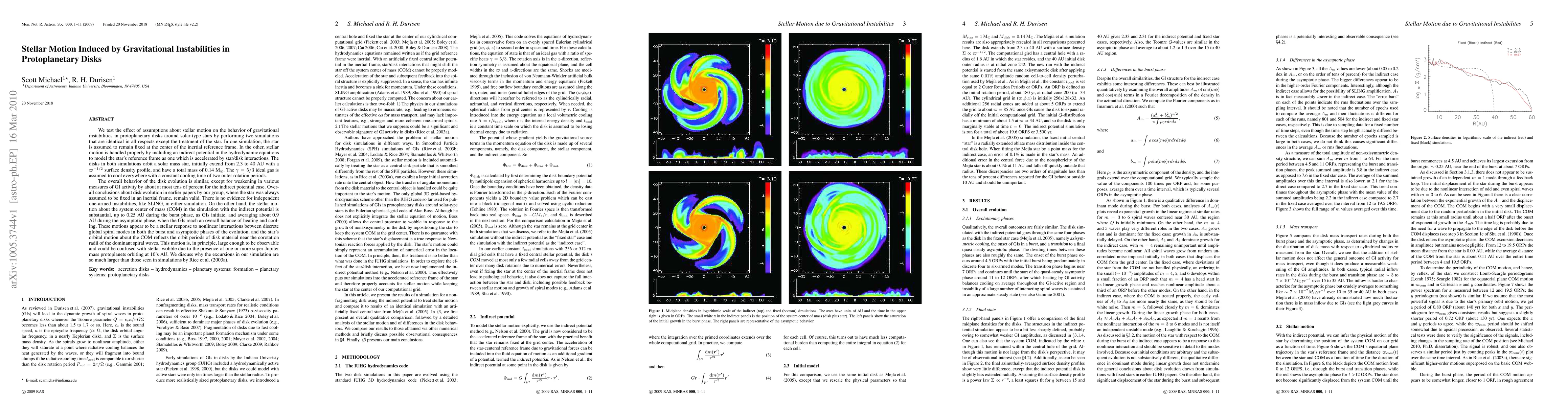 We test the effect of assumptions about stellar motion on the behavior of gravitational instabilities in protoplanetary disks around solar-type stars by performing two simulations that are identical in all respects except the treatment of the star. In one simulation, the star is assumed to remain fixed at the center of the inertial reference frame. In the other, stellar motion is handled properly by including an indirect potential in the hydrodynamic equations to model the star's reference frame as one which is accelerated by star/disk interactions. The disks in both simulations orbit a solar mass star, initially extend from 2.3 to 40 AU with a r^-1/2 surface density profile, and have a total mass of 0.14 M_sun. The gamma = 5/3 ideal gas is assumed to cool everywhere with a constant cooling time of two outer rotation periods. The overall behavior of the disk evolution is similar, except for weakening in various measures of GI activity by about at most tens of percent for the indirect potential case. Overall conclusions about disk evolution in earlier papers by our group, where the star was always assumed to be fixed in an inertial frame, remain valid. There is no evidence for independent one-armed instabilities, like SLING, in either simulation. On the other hand, the stellar motion about the system center of mass (COM) in the simulation with the indirect potential is substantial, up to 0.25 AU during the burst phase, as GIs initiate, and averaging about 0.9 AU during the asymptotic phase, when the GIs reach an overall balance of heating and cooling. These motions appear to be a stellar response to nonlinear interactions between discrete global spiral modes in both the burst and asymptotic phases of the evolution, and the star's orbital motion about the COM reflects the orbit periods of disk material near the corotation radii of the dominant spiral waves. This motion is, in principle, large enough to be observable and could be confused with stellar wobble due to the presence of one or more super-Jupiter mass protoplanets orbiting at 10's AU. We discuss why the excursions in our simulation are so much larger than those seen in simulations by Rice et al. 2003a.