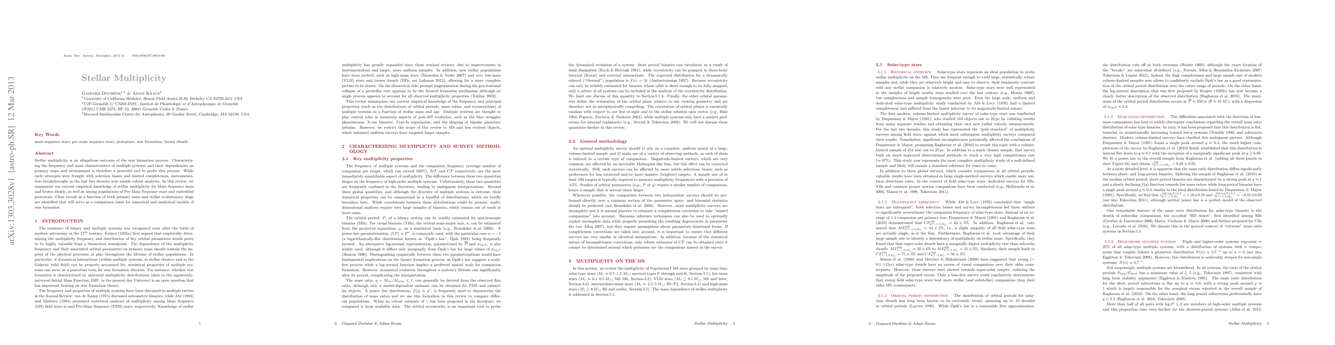 This review summarizes current knowledge of stellar multiplicity, identifying trends related to primary mass and evolutionary stage that will inform star formation models. It provides a foundation for further analysis and comparison with numerical models.