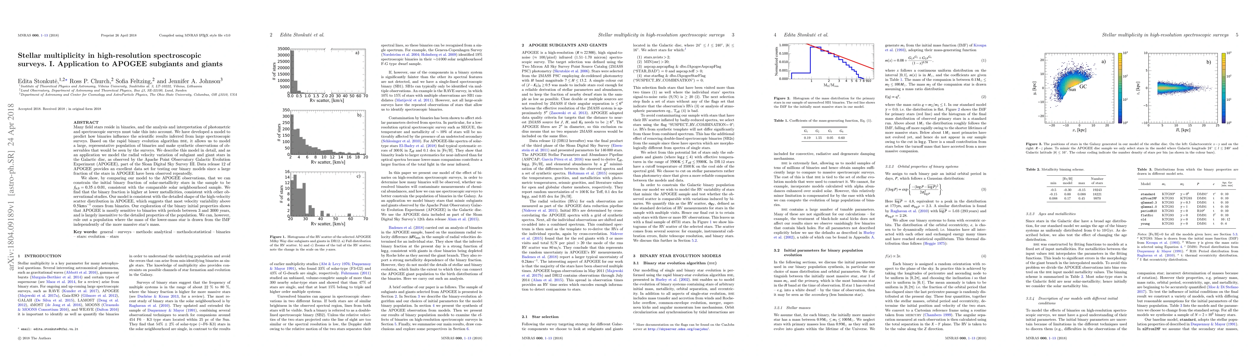 This paper develops a model to predict binary star influences on spectroscopic survey results, applying it to APOGEE observations of subgiants and giants. The model, based on the BSE binary evolution code, finds that the initial binary fraction for solar-metallicity stars is $f_{\rm b,0}=0.35\pm0.01$, with higher fractions at lower metallicities, and matches the observed high-velocity scatter, indicating most variability comes from binaries.
