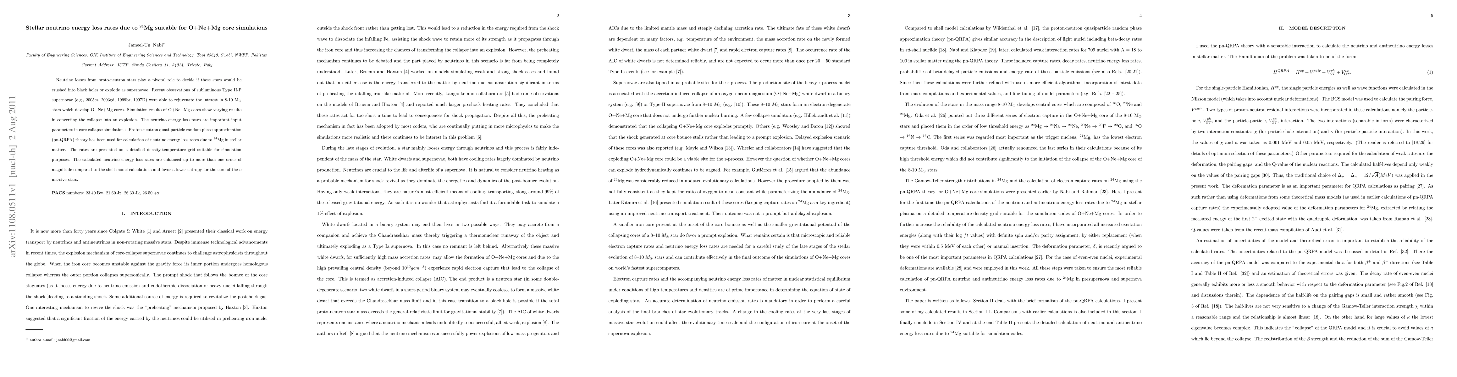 This paper calculates enhanced neutrino energy loss rates due to $^{24}$Mg in O+Ne+Mg stellar cores using pn-QRPA theory, which are crucial for core collapse simulations and suggest lower entropy conditions for massive stars. These results could influence the outcomes of supernovae from 8-10 M$_{\odot}$ stars.