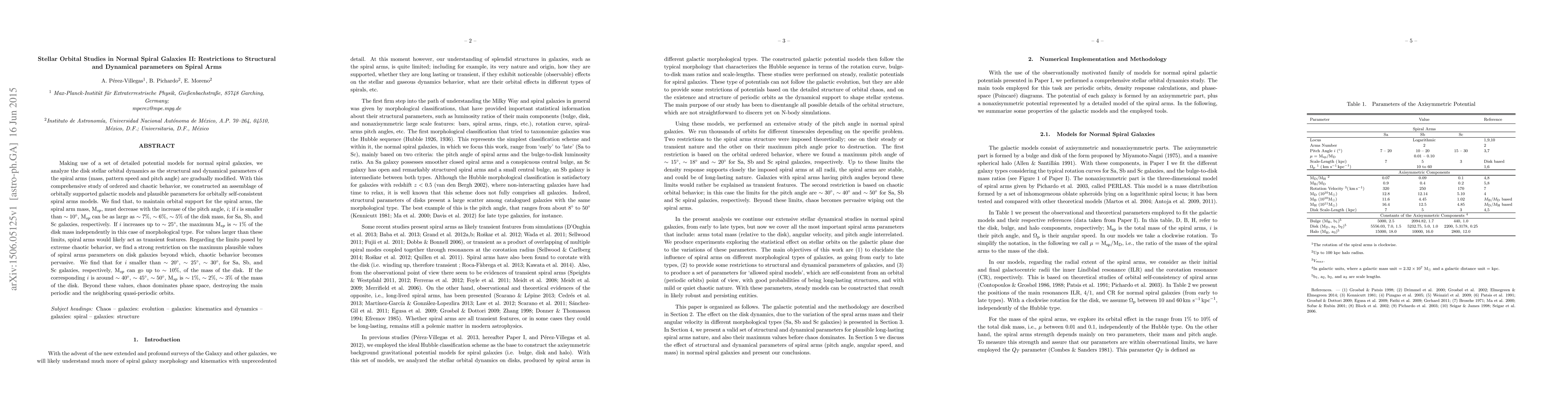 Making use of a set of detailed potential models for normal spiral galaxies, we analyze the disk stellar orbital dynamics as the structural and dynamical parameters of the spiral arms (mass, pattern speed and pitch angle) are gradually modified. With this comprehensive study of ordered and chaotic behavior, we constructed an assemblage of orbitally supported galactic models and plausible parameters for orbitally self-consistent spiral arms models. We find that, to maintain orbital support for the spiral arms, the spiral arm mass, M$_{sp}$, must decrease with the increase of the pitch angle, $i$; if $i$ is smaller than $\sim10\deg$, M$_{sp}$ can be as large as $\sim7\%$, $\sim6\%$, $\sim5\%$ of the disk mass, for Sa, Sb, and Sc galaxies, respectively. If $i$ increases up to $\sim25\deg$, the maximum M$_{sp}$ is $\sim1\%$ of the disk mass independently in this case of morphological type. For values larger than these limits, spiral arms would likely act as transient features. Regarding the limits posed by extreme chaotic behavior, we find a strong restriction on the maximum plausible values of spiral arms parameters on disk galaxies beyond which, chaotic behavior becomes pervasive. We find that for $i$ smaller than $\sim20\deg$, $\sim25\deg$, $\sim30\deg$, for Sa, Sb, and Sc galaxies, respectively, M$_{sp}$ can go up to $\sim10\%$, of the mass of the disk. If the corresponding $i$ is around $\sim40\deg$, $\sim45\deg$, $\sim50\deg$, M$_{sp}$ is $\sim1\%$, $\sim2\%$, $\sim3\%$ of the mass of the disk. Beyond these values, chaos dominates phase space, destroying the main periodic and the neighboring quasi-periodic orbits.