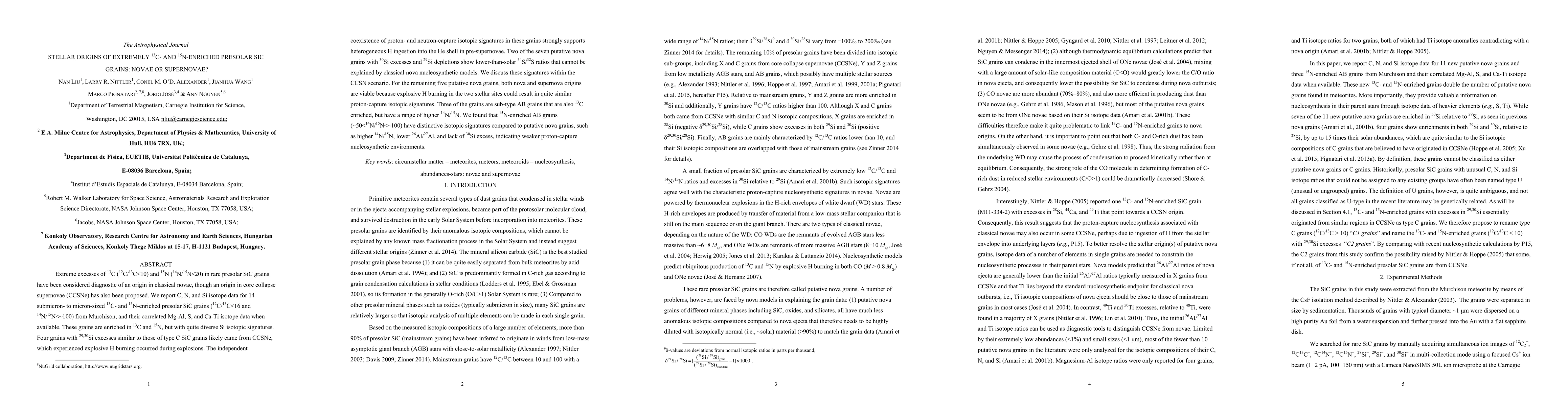 Researchers study presolar SiC grains for clues on their origin, finding that some may have come from core collapse supernovae and others from classical novae, with unique isotopic signatures in each group.