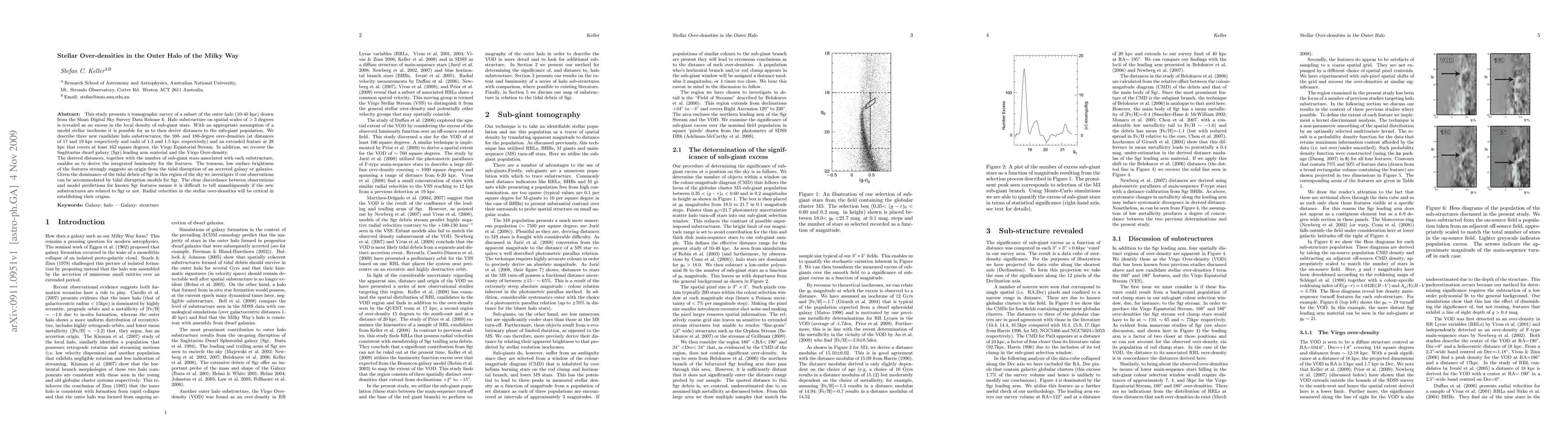 This study presents a tomographic survey of a subset of the outer halo (10-40 kpc) drawn from the Sloan Digital Sky Survey Data Release 6. Halo substructure on spatial scales of $>3$ degrees is revealed as an excess in the local density of sub-giant stars. With an appropriate assumption of a model stellar isochrone it is possible for us to then derive distances to the sub-giant population. We describe three new candidate halo substructures; the 160- and 180-degree over-densities (at distances of 17 and 19 kpc respectively and radii of 1.3 and 1.5 kpc respectively) and an extended feature at 28 kpc that covers at least 162 square degrees, the Virgo Equatorial Stream. In addition, we recover the Sagittarius dwarf galaxy (Sgr) leading arm material and the Virgo Over-density. The derived distances, together with the number of sub-giant stars associated with each substructure, enables us to derive the integrated luminosity for the features. The tenuous, low surface brightness of the features strongly suggests an origin from the tidal disruption of an accreted galaxy or galaxies. Given the dominance of the tidal debris of Sgr in this region of the sky we investigate if our observations can be accommodated by tidal disruption models for Sgr. The clear discordance between observations and model predictions for known Sgr features means it is difficult to tell unambiguously if the new substructures are related to Sgr or not. Radial velocities in the stellar over-densities will be critical in establishing their origins.