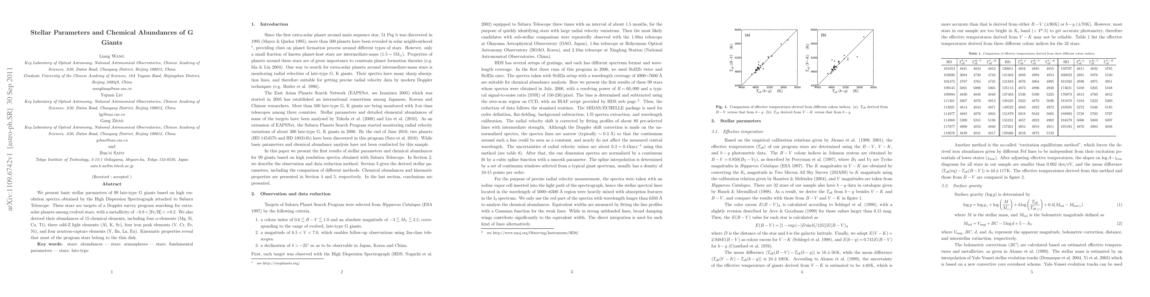 We present basic stellar parameters of 99 late-type G giants based on high resolution spectra obtained by the High Dispersion Spectrograph attached to Subaru Telescope. These stars are targets of a Doppler survey program searching for extra-solar planets among evolved stars, with a metallicity of -0.8<[Fe/H]<+0.2. We also derived their abundances of 15 chemical elements, including four $\alpha$-elements (Mg, Si, Ca, Ti), three odd-Z light elements (Al, K, Sc), four iron peak elements (V, Cr, Fe, Ni), and four neutron-capture elements (Y, Ba, La, Eu). Kinematic properties reveal that most of the program stars belong to the thin disk.