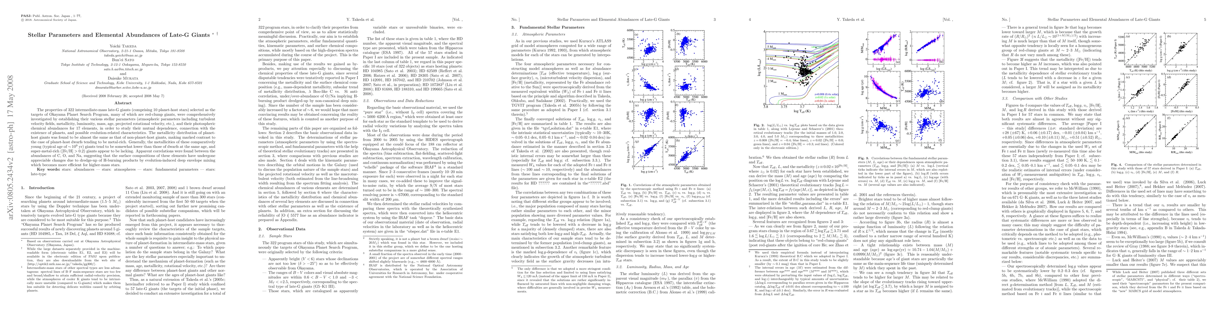 This study investigates the stellar parameters and elemental abundances of 322 late-G giants, including 10 planet-hosting stars, revealing no significant metallicity difference between planet-hosting and non-hosting giants, unlike the trend seen in planet-hosting dwarfs. The research highlights correlations between C, O, and Na abundances, indicating evolutionary changes due to deep envelope mixing.