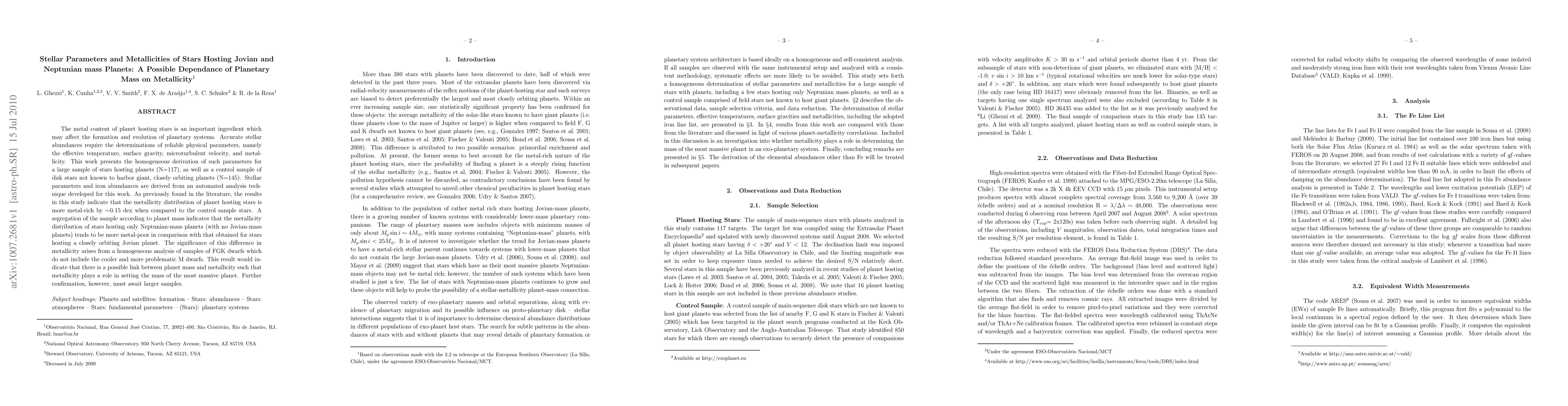 This study investigates stellar parameters and metallicities of stars hosting Jovian and Neptunian mass planets, finding a more metal-rich distribution in planet-hosting stars compared to non-hosting stars. It suggests a possible link between metallicity and planet mass, with stars hosting only Neptunian-mass planets showing lower metallicity.