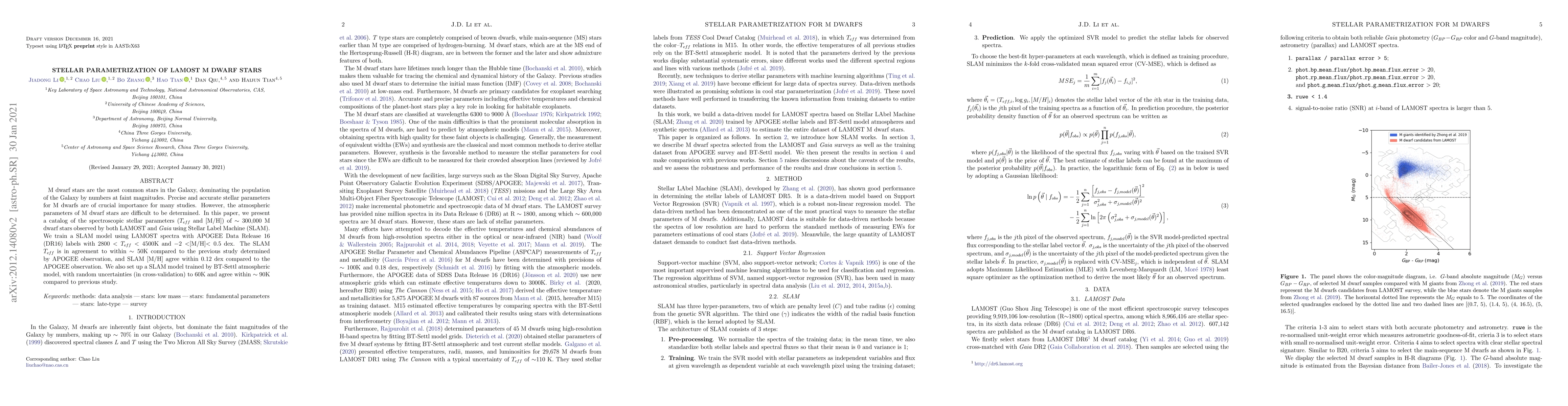 M dwarf stars are the most common stars in the Galaxy, dominating the population of the Galaxy by numbers at faint magnitudes. Precise and accurate stellar parameters for M dwarfs are of crucial importance for many studies. However, the atmospheric parameters of M dwarf stars are difficult to be determined. In this paper, we present a catalog of the spectroscopic stellar parameters ($T_{eff}$ and [M/H]) of $\sim$ 300,000 M dwarf stars observed by both LAMOST and Gaia using Stellar Label Machine (SLAM). We train a SLAM model using LAMOST spectra with APOGEE Data Release 16 (DR16) labels with $2800 \lt T_{eff} \lt 4500$K and $-2 \lt [M/H] \lt 0.5$ dex. The SLAM $T_{eff}$ is in agreement to within $\sim 50$K compared to the previous study determined by APOGEE observation, and SLAM [M/H] agree within 0.12 dex compared to the APOGEE observation. We also set up a SLAM model trained by BT-Settl atmospheric model, with random uncertainties (in cross-validation) to 60K and agree within $\sim 90$K compared to previous study.