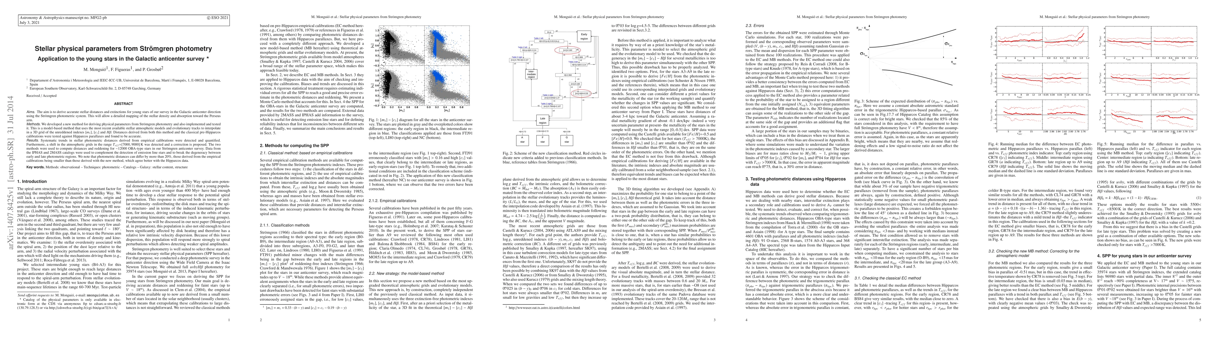 Aims. The aim is to derive accurate stellar distances and extinctions for young stars of our survey in the Galactic anticenter direction using the Str\"omgren photometric system. This will allow a detailed mapping of the stellar density and absorption toward the Perseus arm. Methods. We developed a new method for deriving physical parameters from Str\"omgren photometry and also implemented and tested it. This is a model-based method that uses the most recent available stellar atmospheric models and evolutionary tracks to interpolate in a 3D grid of the unreddened indexes [m1], [c1] and Hbeta. Distances derived from both this method and the classical pre-Hipparcos calibrations were tested against Hipparcos parallaxes and found to be accurate. Results. Systematic trends in stellar photometric distances derived from empirical calibrations were detected and quantified. Furthermore, a shift in the atmospheric grids in the range Teff=[7000,9000]K was detected and a correction is proposed. The two methods were used to compute distances and reddening for about 12000 OBA-type stars in our Str\"omgren anticenter survey. Data from the IPHAS and 2MASS catalogs were used to complement the detection of emission line stars and to break the degeneracy between early and late photometric regions. We note that photometric distances can differ by more than 20%, those derived from the empirical calibrations being smaller than those derived with the new method, which agree better with the Hipparcos data.