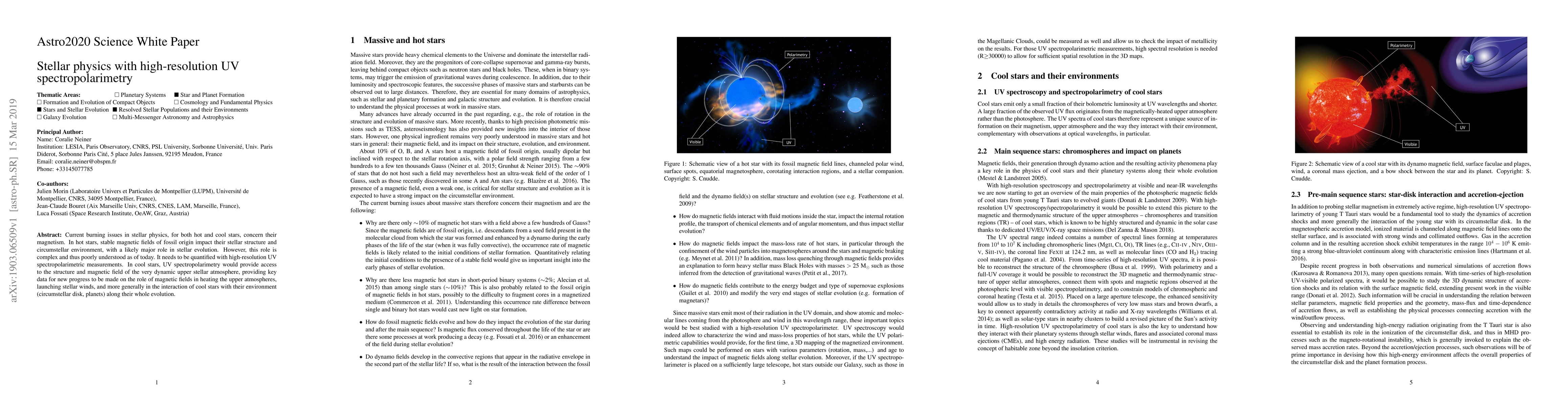 Current burning issues in stellar physics, for both hot and cool stars, concern their magnetism. In hot stars, stable magnetic fields of fossil origin impact their stellar structure and circumstellar environment, with a likely major role in stellar evolution. However, this role is complex and thus poorly understood as of today. It needs to be quantified with high-resolution UV spectropolarimetric measurements. In cool stars, UV spectropolarimetry would provide access to the structure and magnetic field of the very dynamic upper stellar atmosphere, providing key data for new progress to be made on the role of magnetic fields in heating the upper atmospheres, launching stellar winds, and more generally in the interaction of cool stars with their environment (circumstellar disk, planets) along their whole evolution.