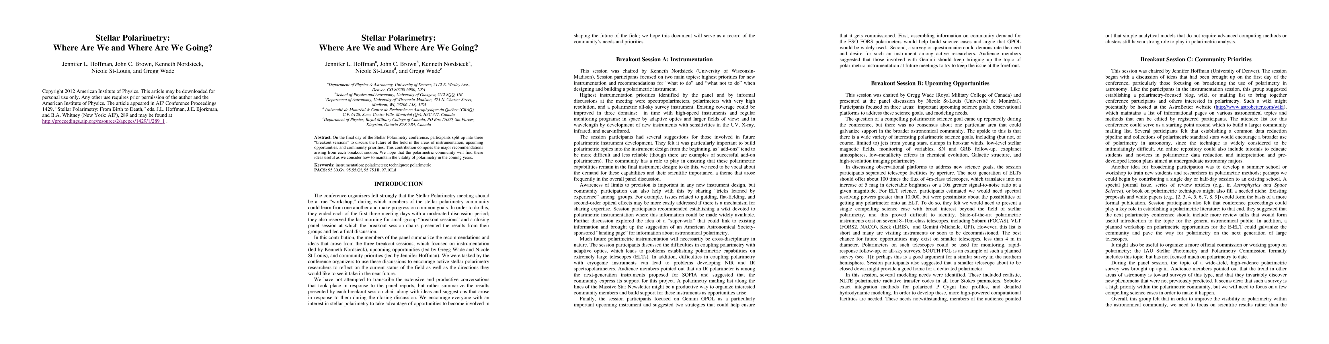 On the final day of the Stellar Polarimetry conference, participants split up into three "breakout sessions" to discuss the future of the field in the areas of instrumentation, upcoming opportunities, and community priorities. This contribution compiles the major recommendations arising from each breakout session. We hope that the polarimetric community will find these ideas useful as we consider how to maintain the vitality of polarimetry in the coming years.
