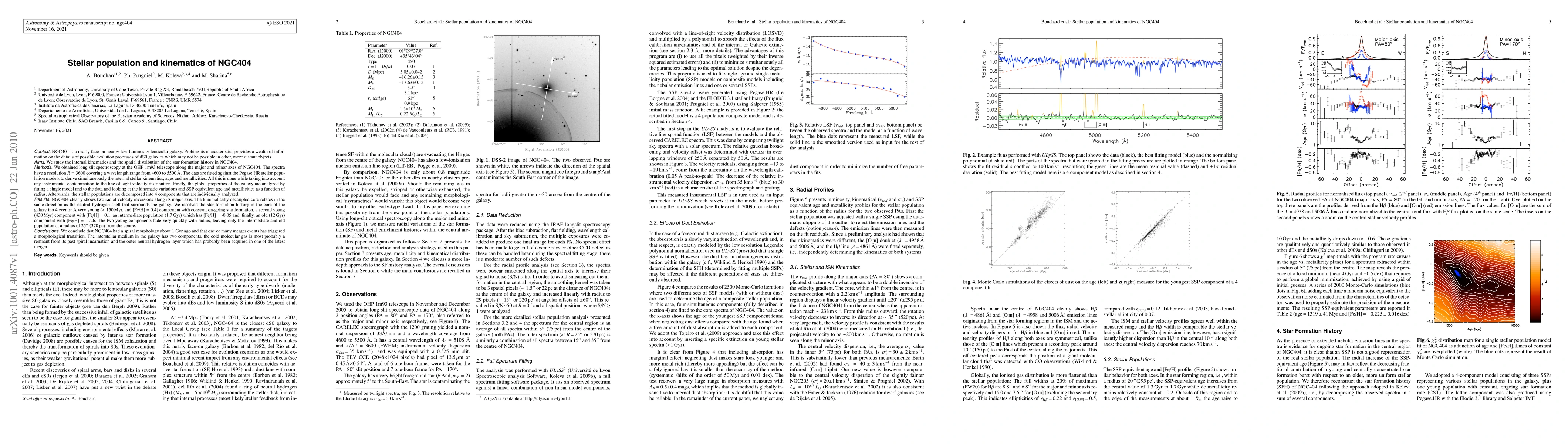 NGC404 is a nearly face-on nearby low-luminosity lenticular galaxy. Probing its characteristics provides a wealth of information on the details of possible evolution processes of dS0 galaxies which may not be possible in other, more distant objects. In order to study its kinematics and star formation history, we obtained long slit spectroscopy at the OHP 1m93 telescope along the major and minor axes of NGC404. The spectra have a resolution R = 3600 covering a wavelength range from 4600 to 5500 A. The data are fitted against the Pegase.HR stellar population models to derive simultaneously the internal stellar kinematics, ages and metallicities. Firstly, the global properties of the galaxy are analyzed by fitting a single model and to the data and looking at the kinematic variations and SSP equivalent age and metallicities as a function of radius. Afterwards, the stellar populations are decomposed into 4 components that are individually analyzed. NGC404 clearly shows two radial velocity inversions along its major axis. The kinematically decoupled core rotates in the same direction as the neutral hydrogen shell that surrounds the galaxy. We resolved the star formation history in the core of the galaxy ino 4 events: A very young (< 150 Myr, and [Fe/H] = 0.4) component with constant on-going star formation, a second young (430 Myr) component with [Fe/H] = 0.1, an intermediate population (1.7 Gyr) which has [Fe/H] = -0.05 and, finally, an old (12 Gyr) component with [Fe/H] = -1.26. The two young components fade very quickly with radius, leaving only the intermediate and old population at a radius of 25" (370 pc) from the centre. We conclude that NGC404 had a spiral morphology about 1 Gyr ago and that one or many merger events has triggered a morphological transition.
