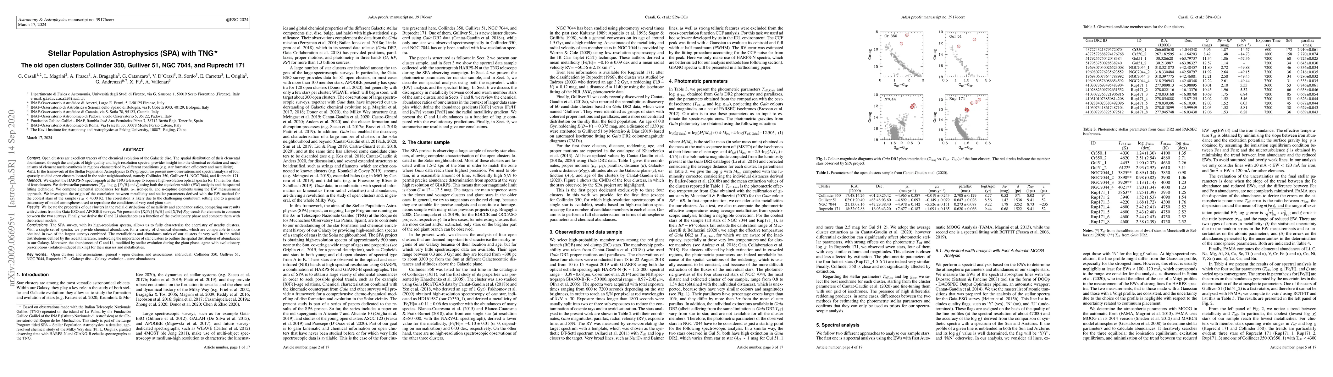 In the framework of the Stellar Population Astrophysics (SPA) project, we present new observations and spectral analysis of four sparsely studied open clusters, namely Collinder 350, Gulliver 51, NGC 7044, and Ruprecht 171. We exploit the HARPS-N spectrograph at the TNG telescope to acquire high-resolution optical spectra for 15 member stars of four clusters. We derive stellar parameters using both the EW analysis and the spectral fitting technique. We compute elemental abundances for light, a-, iron-peak, and n-capture elements using the EW measurement approach. We investigate the origin of the correlation between metallicity and stellar parameters derived with the EW method for the coolest stars of the sample (Teff < 4300 K). The correlation is likely due to the challenging continuum setting and to a general inaccuracy of model atmospheres used to reproduce the conditions of very cool giant stars. We locate the properties of our clusters in the radial distributions of metallicity and abundance ratios, comparing our results with clusters from the Gaia-ESO and APOGEE surveys. We present the [X/Fe]-[Fe/H] and [X/Fe]-Rgc trends for elements in common between the two surveys and derive the C and Li abundances as a function of the evolutionary phase and compare them with theoretical models. The SPA survey allows us to fully characterise the chemistry of nearby clusters. With a single set of spectra, we provide chemical abundances for some chemical elements, which are comparable to those obtained in two of the largest surveys combined. The metallicities and abundance ratios of our clusters fit very well in the radial distributions defined by the recent literature, reinforcing the importance of star clusters to outline the spatial distribution of abundances in our Galaxy. Moreover, the abundances of C and Li agree with evolutionary prescriptions for their masses and metallicities.