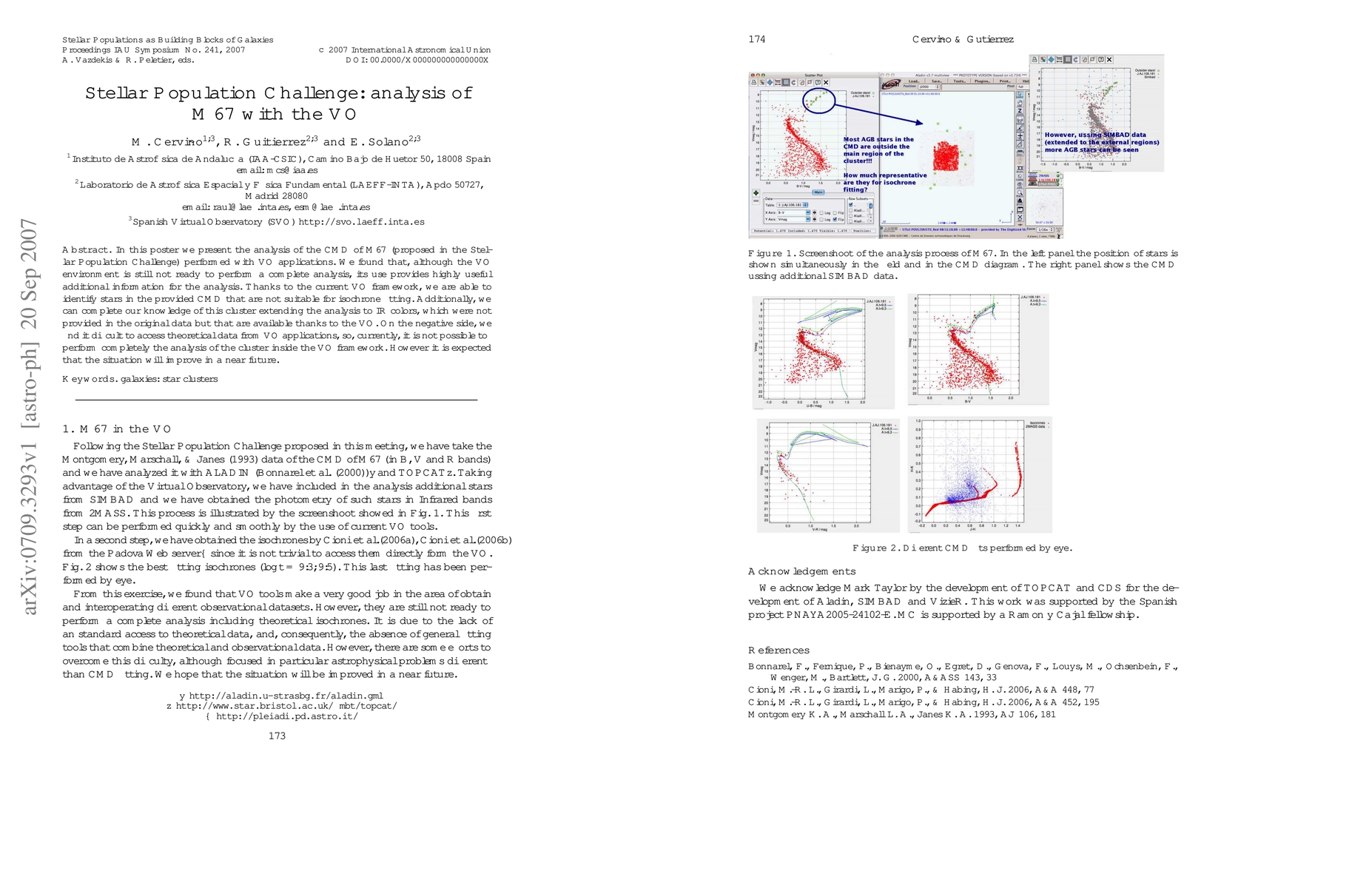 In this poster we present the analysis of the CMD of M67 (proposed in the Stellar Population Challenge) performed with VO applications. We found that, although the VO environment is still not ready to perform a complete analysis, its use provides highly useful additional information for the analysis. Thanks to the current VO framework, we are able to identify stars in the provided CMD that are not suitable for isochrone fitting. Additionally, we can complete our knowledge of this cluster extending the analysis to IR colors, which were not provided in the original data but that are available thanks to the VO. On the negative side, we find it difficult to access theoretical data from VO applications, so, currently, it is not possible to perform completely the analysis of the cluster inside the VO framework. However it is expected that the situation will improve in a near future.