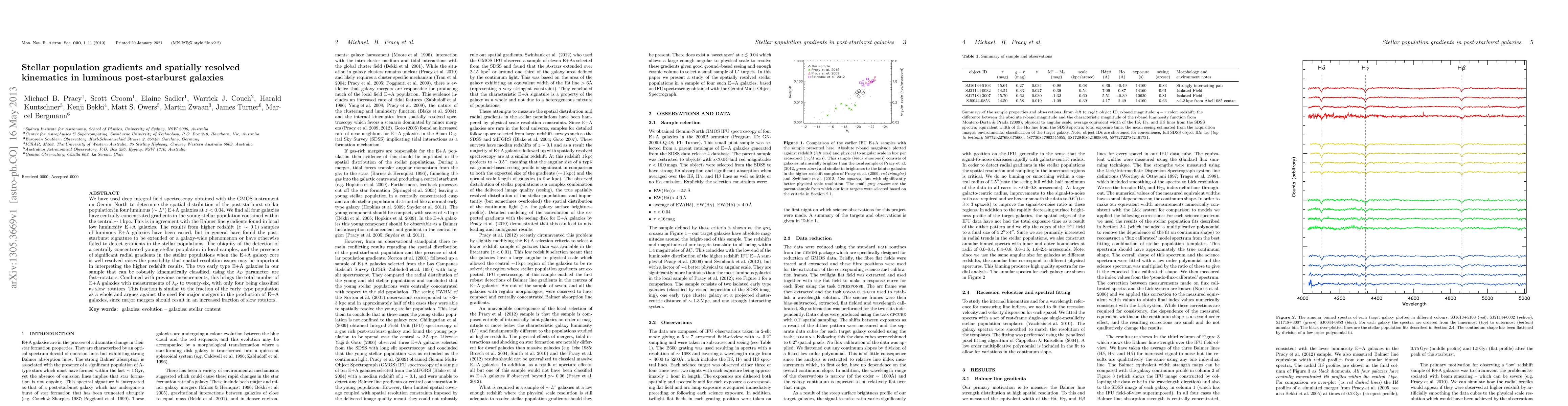 This study uses GMOS spectroscopy to analyze four luminous post-starburst galaxies, finding centrally-concentrated young stellar populations and significant radial gradients. The results suggest spatial resolution may impact interpretations of higher redshift samples. Additionally, the galaxies exhibit fast rotation, supporting the notion that major mergers are unlikely in their formation.