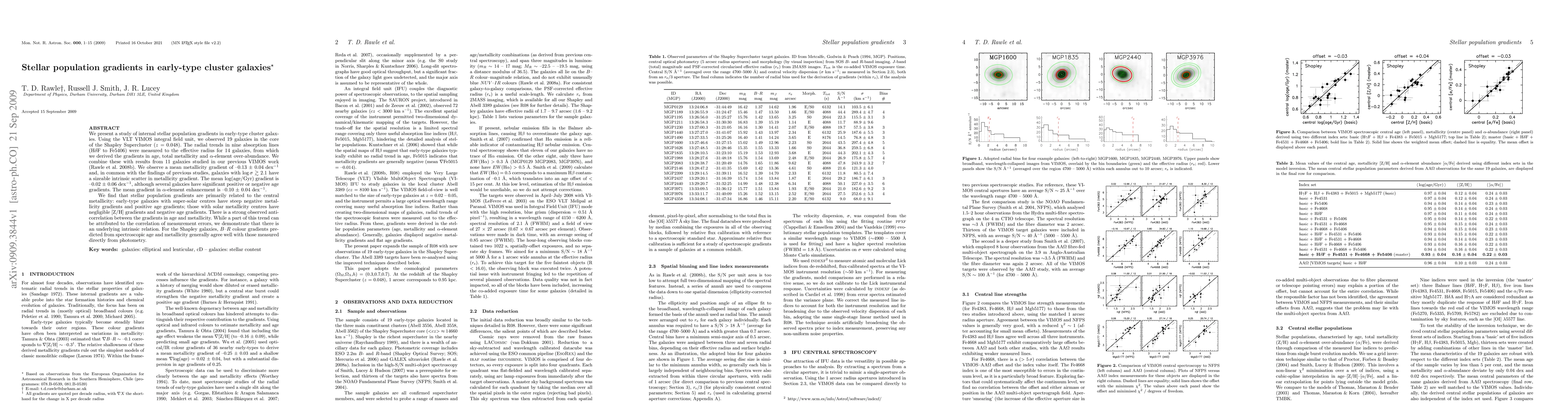 We present a study of internal stellar population gradients in early-type cluster galaxies. Using the VLT VIMOS integral field unit, we observed 19 galaxies in the core of the Shapley Supercluster (z = 0.048). The radial trends in nine absorption lines (HdF to Fe5406) were measured to the effective radius for 14 galaxies, from which we derived the gradients in age, total metallicity and alpha-element over-abundance. We combine these with results from 11 galaxies studied in our previous VIMOS work (Rawle et al 2008). We observe a mean metallicity gradient of -0.13 +/- 0.04 per dex and, in common with the findings of previous studies, galaxies with log(sigma) > 2.1 have a sizeable intrinsic scatter in metallicity gradient. The mean log(age/Gyr) gradient is -0.02 +/- 0.06 per dex, although several galaxies have significant positive or negative age gradients. The mean gradient in alpha-element enhancement is -0.10 +/- 0.04 per dex. We find that stellar population gradients are primarily related to the central metallicity: early-type galaxies with super-solar centres have steep negative metallicity gradients and positive age gradients; those with solar metallicity centres have negligible [Z/H] gradients and negative age gradients. There is a strong observed anti-correlation between the gradients in age and metallicity. While a part of this trend can be attributed to the correlation of measurement errors, we demonstrate that there is an underlying intrinsic relation. For the Shapley galaxies, B-R colour gradients predicted from spectroscopic age and metallicity generally agree well with those measured directly from photometry.