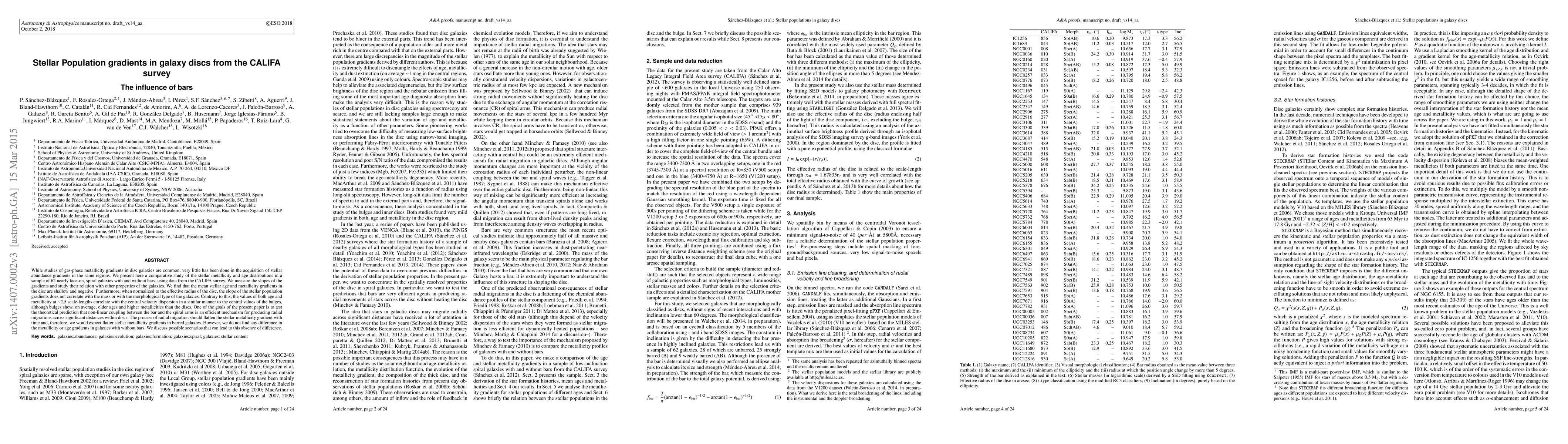This paper investigates stellar metallicity and age gradients in 62 face-on spiral galaxies from the CALIFA survey, finding shallow negative gradients. It finds no correlation between gradient slopes and galaxy mass or morphology, but notes a correlation between the central velocity dispersion and stellar age/metallicity at 2.5 scale-lengths. Despite theoretical predictions, no difference in gradients is observed between barred and non-barred galaxies.